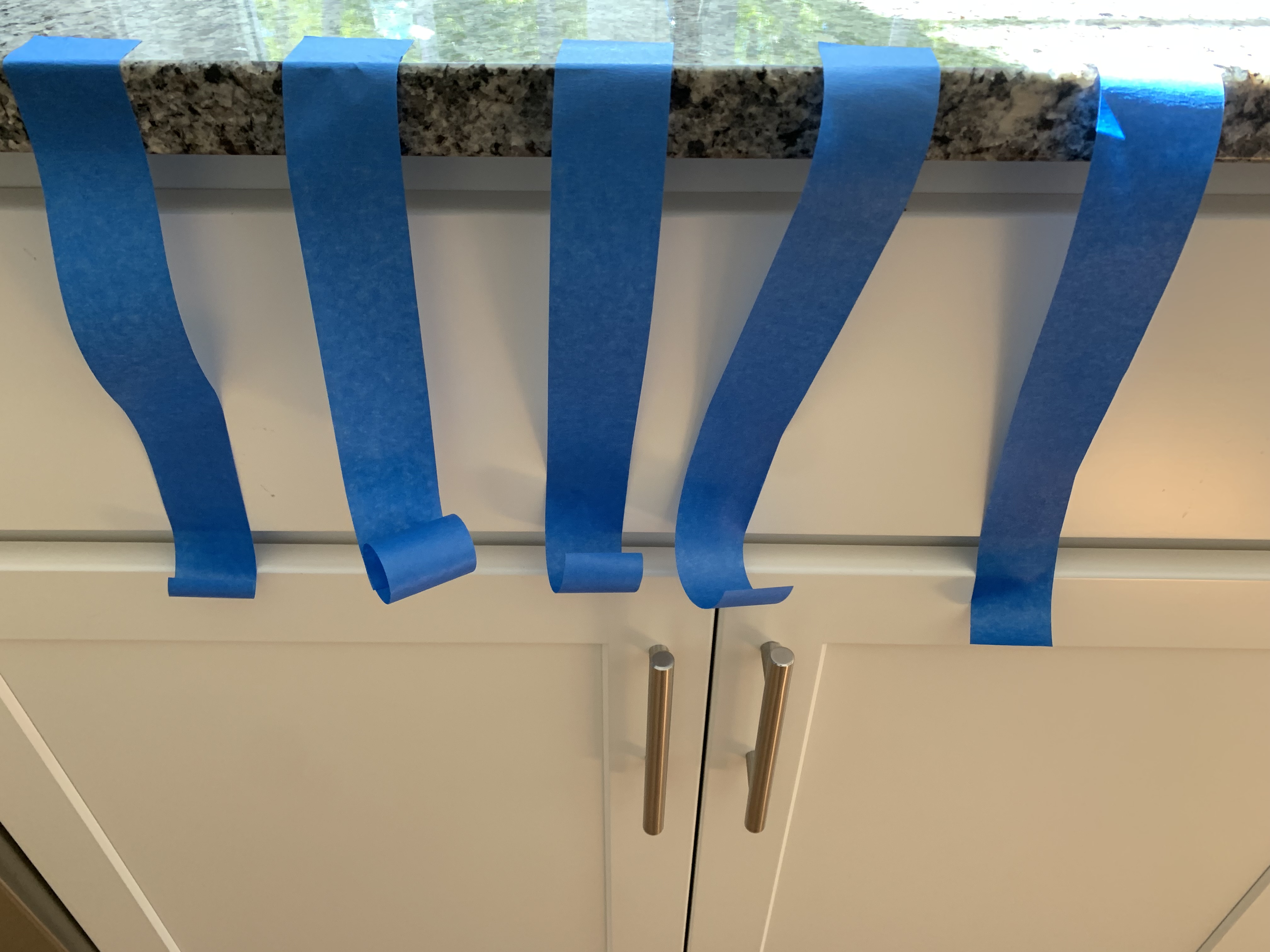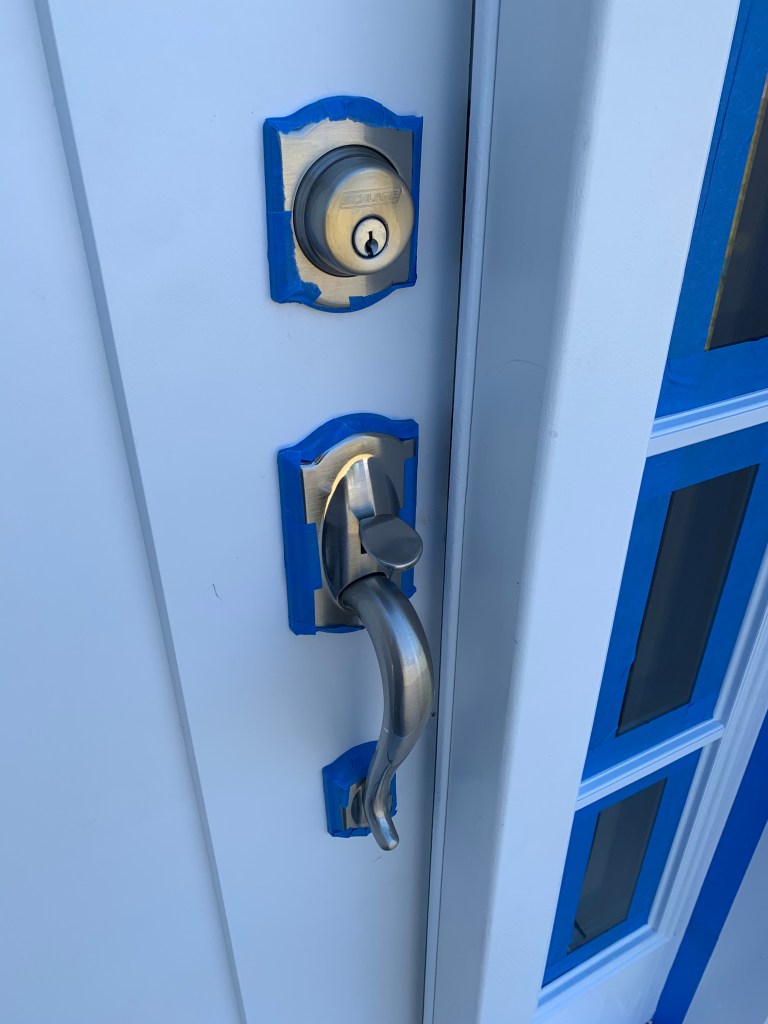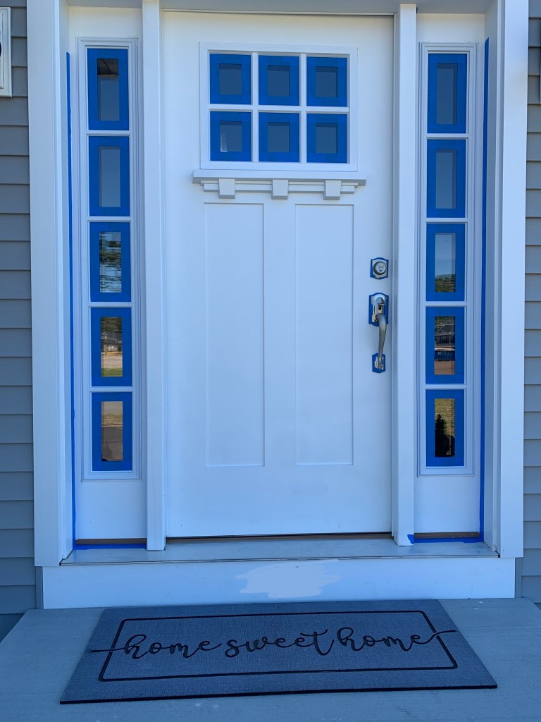 After we got the paint we purchased all of our supplies – brushes, rollers, paint trays, tape and ladders. I set out taping the windows on our front door as well as the knobs on both the front door and our interior garage door while my husband, Cruz, taped the garage doors and removed the hardware. For the windows I measured their dimensions and pre-cut all my tape strips to make it easier to have one single piece to pull up later.
