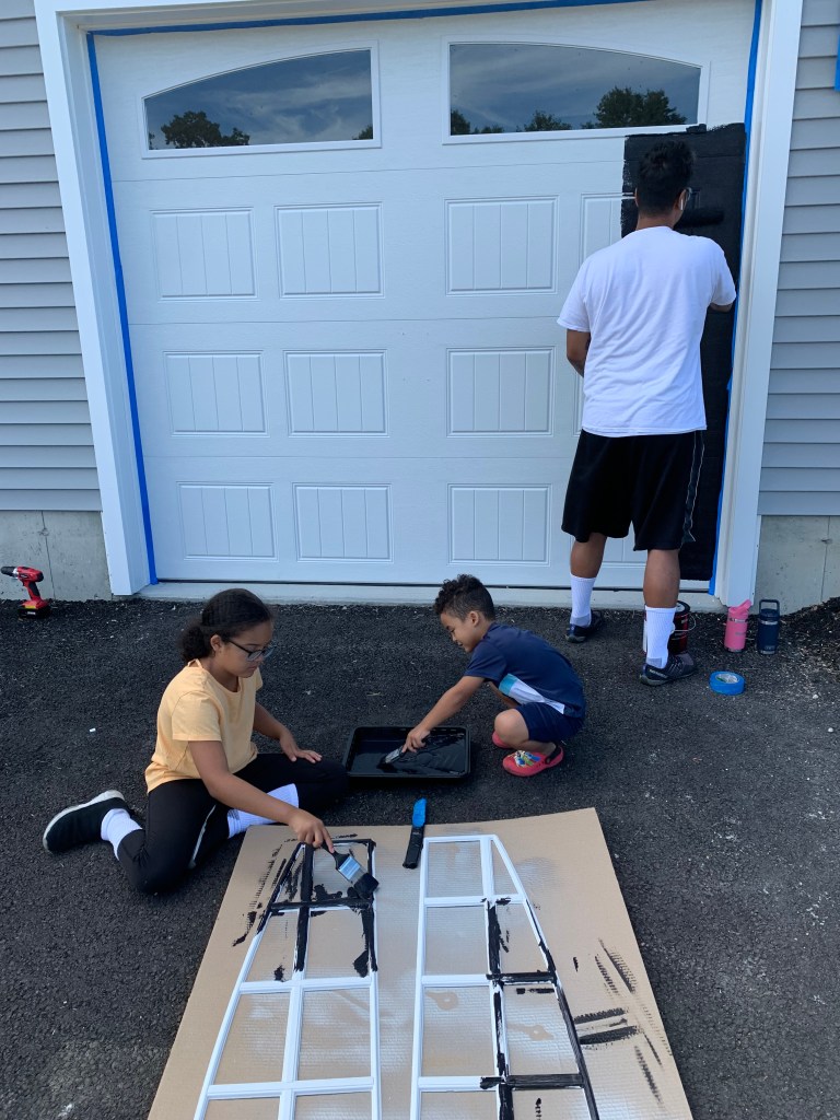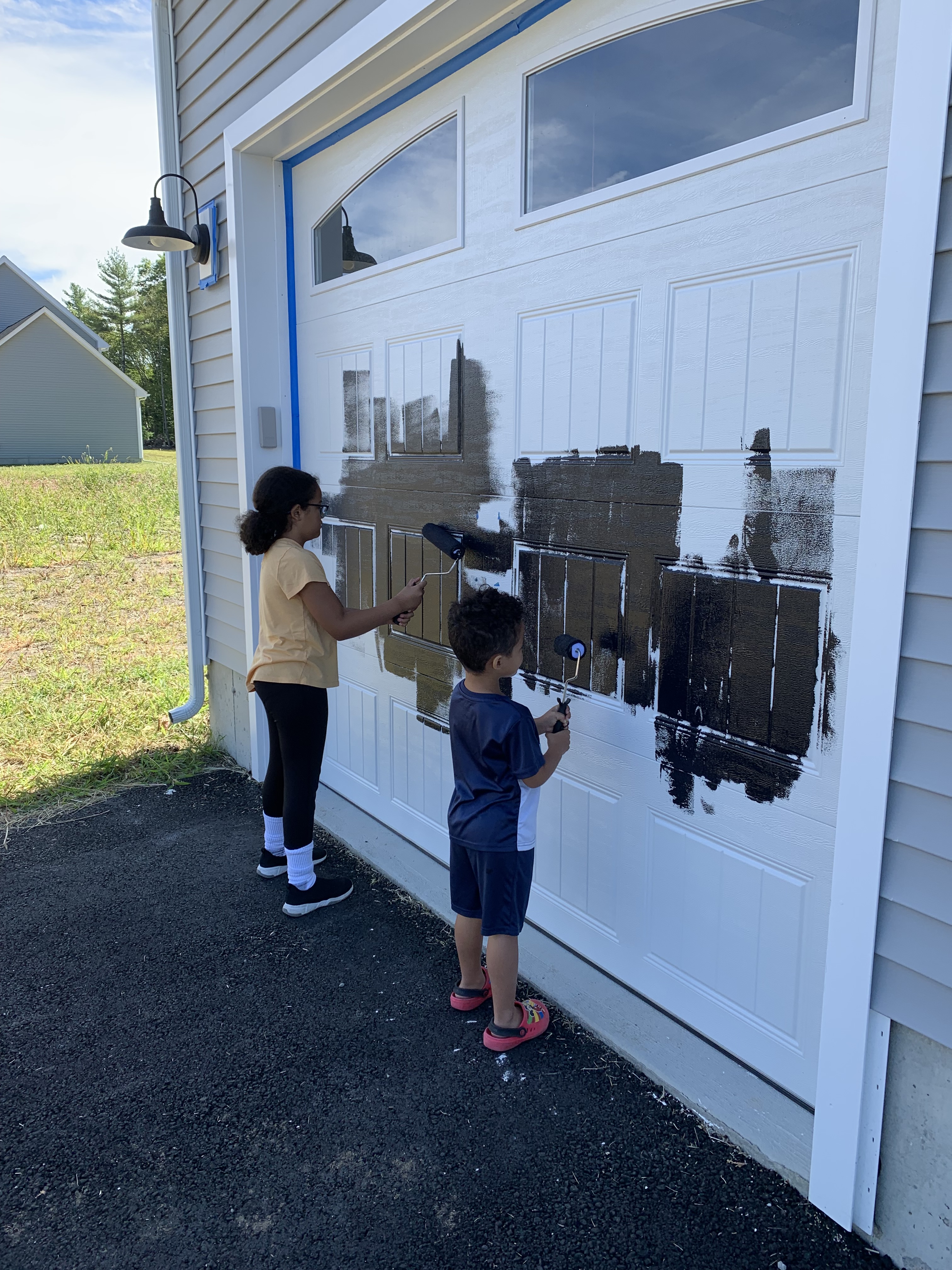 The kids were excited about painting, so they helped with the first coat on the garage doors and window panels.
