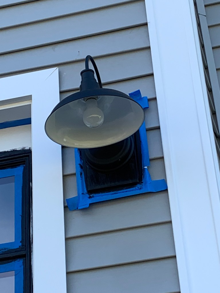 Once we had the garage painted, I still felt like something was missing, I told Cruz we needed to paint the back panels of the light fixtures to mimic the square shape that is so dominant on the front of the house. The circle lights and their circle mounts didnโt look good.