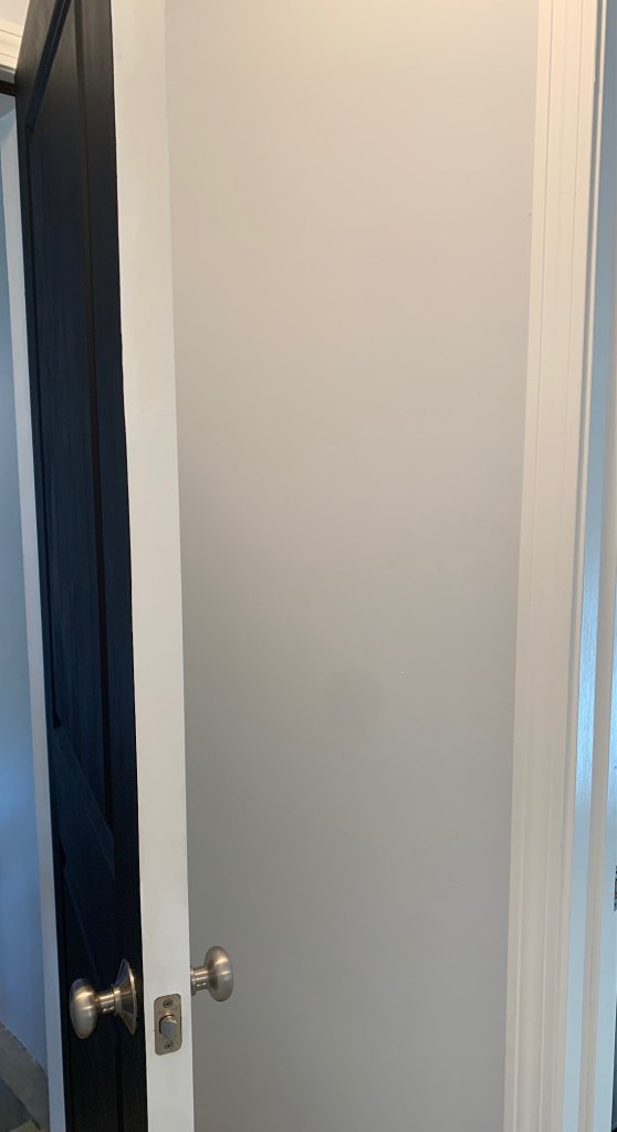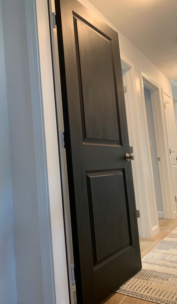 Our interior garage door was also painted black. As I was working on the finishes, I think the hardest part was painting the interior door strip and hinges black and not letting any paint bleed onto the front of the door, which we kept white.