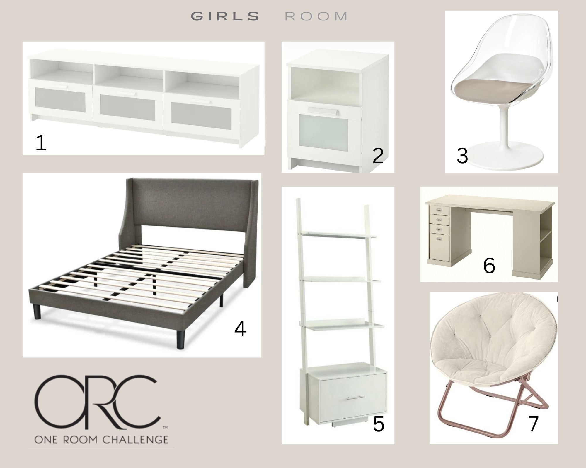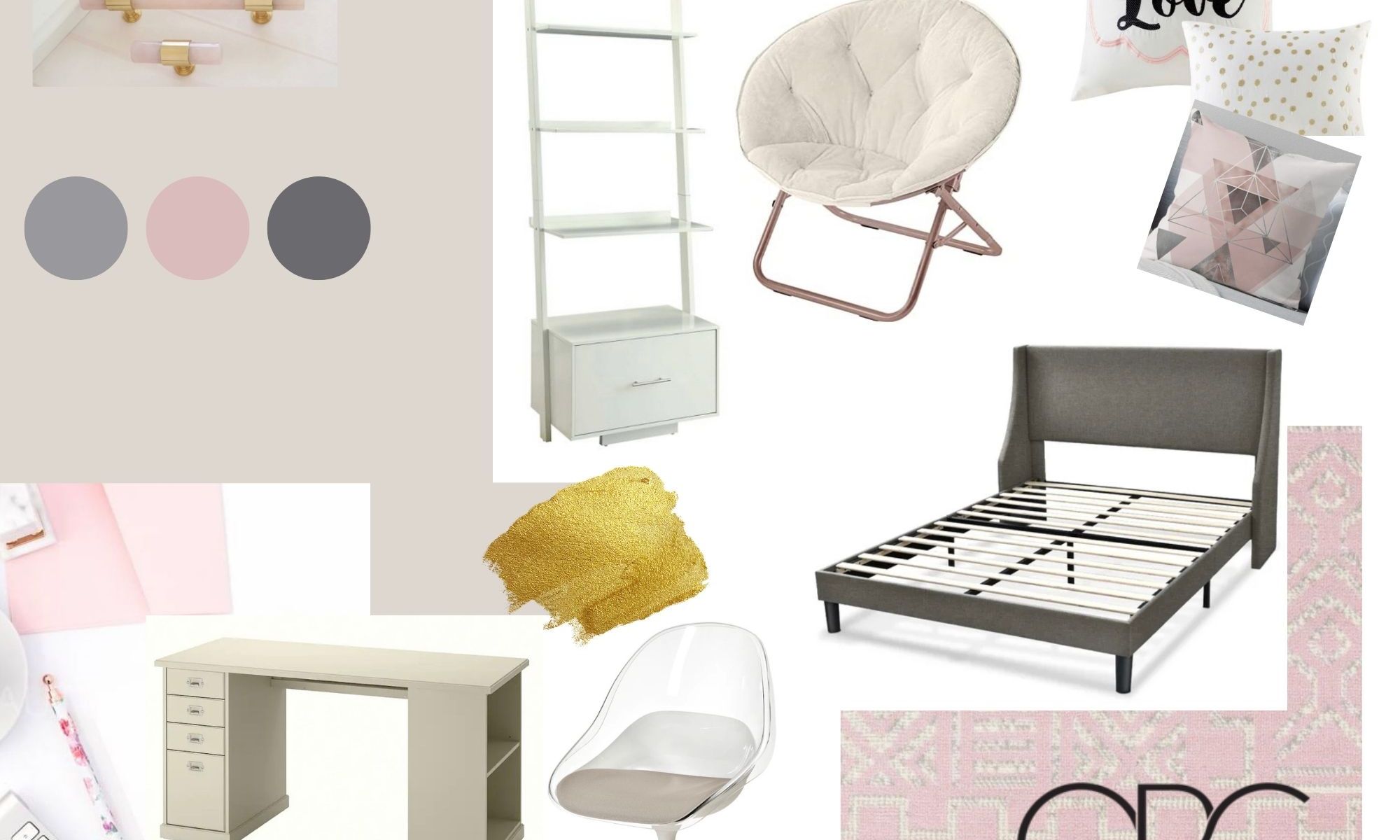 Before mapping out a plan for the One Room Challenge, I knew I first needed to speak with my daughter to find out what she wanted her room to feel like, so I could decide what furniture to purchase. After talking with her I knew she wanted a grey room with pops of blush and she wanted very little pattern. I decided she would have 3 zones in her room – her bed, a study area and a reading area. Once I had finalized the idea I compiled my list and began looking online for the items.