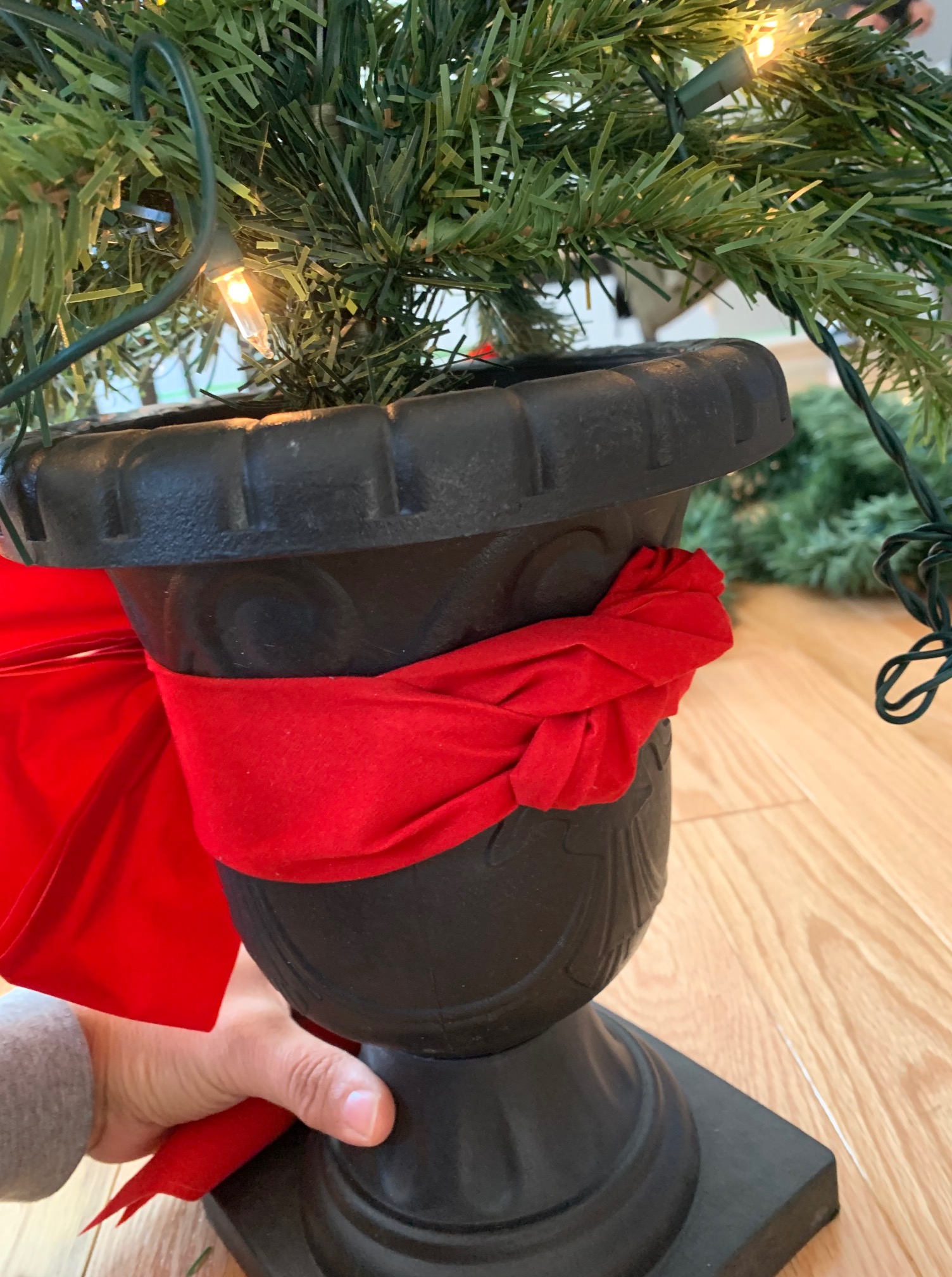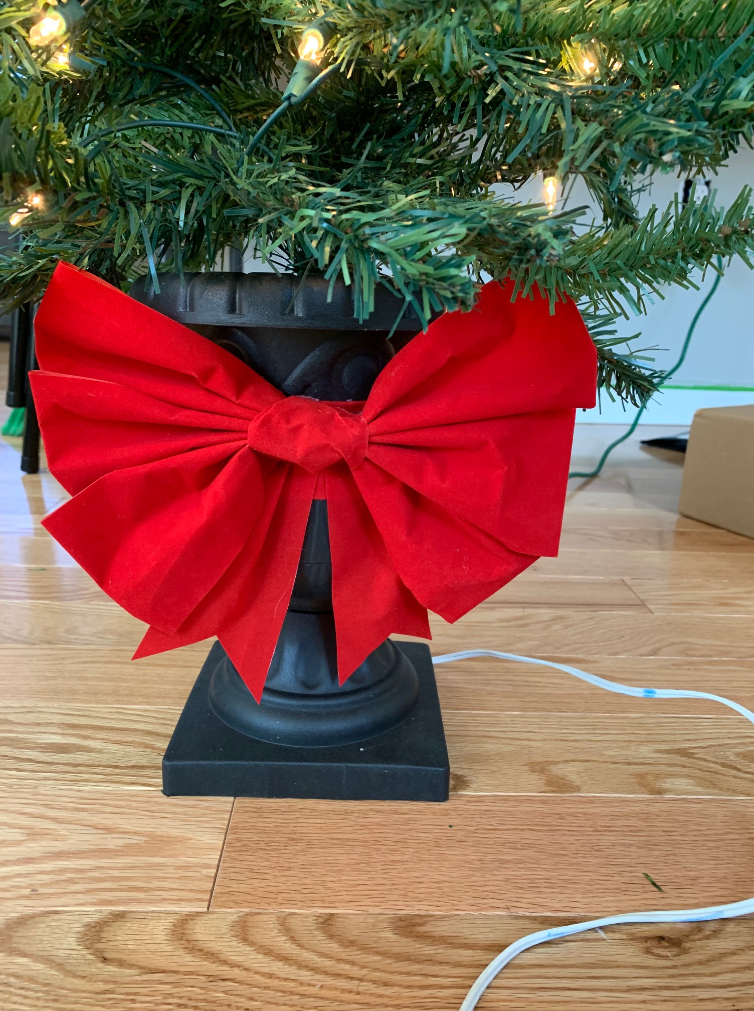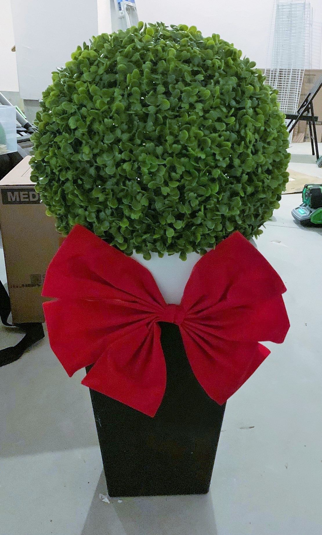 The first thing I did was take apart the large bows. Deconstructing them gave me the option of having 2 different size bows. I used the larger bows in their entirety and wrapped and tied them around our faux boxwood planters.