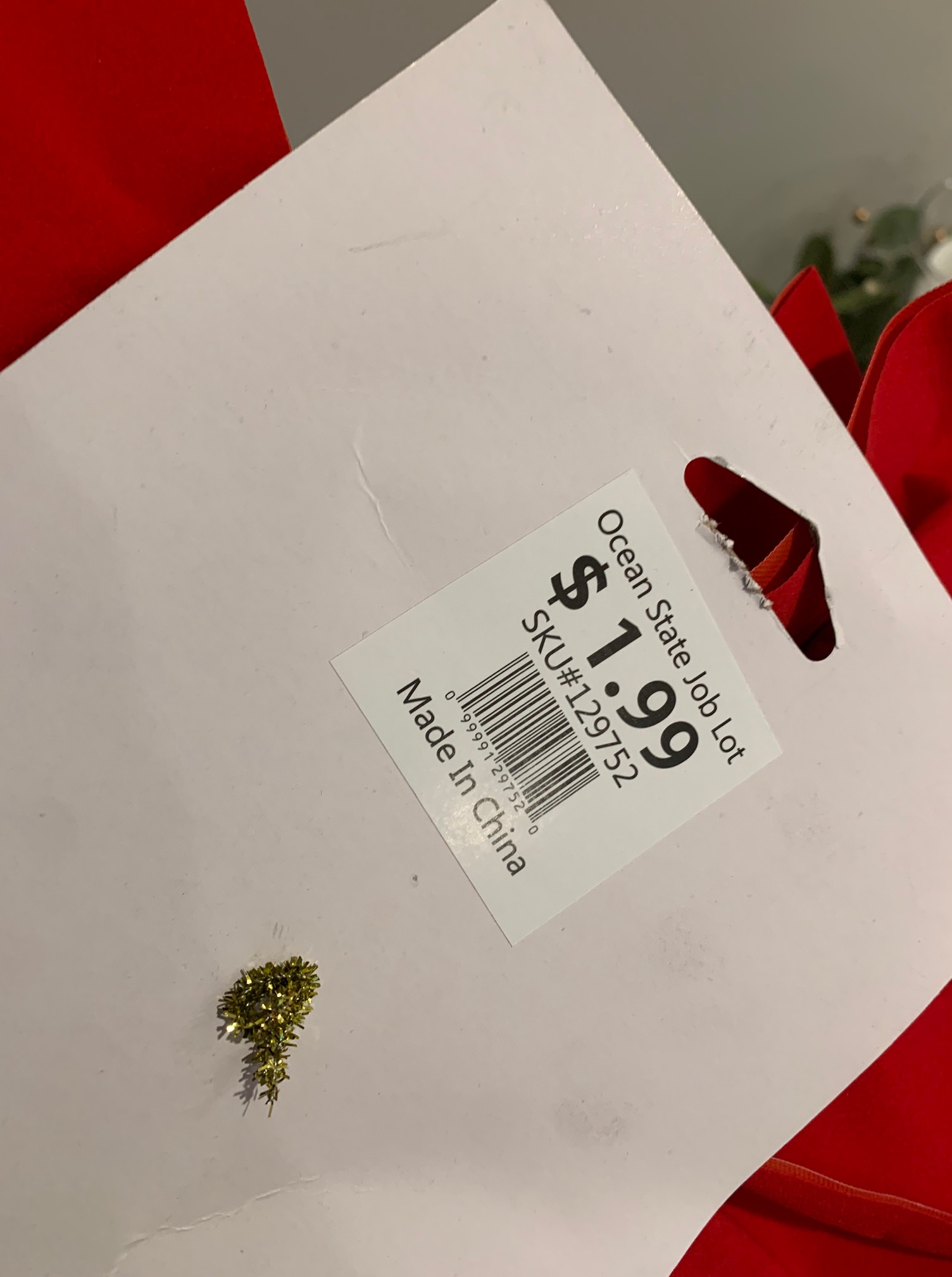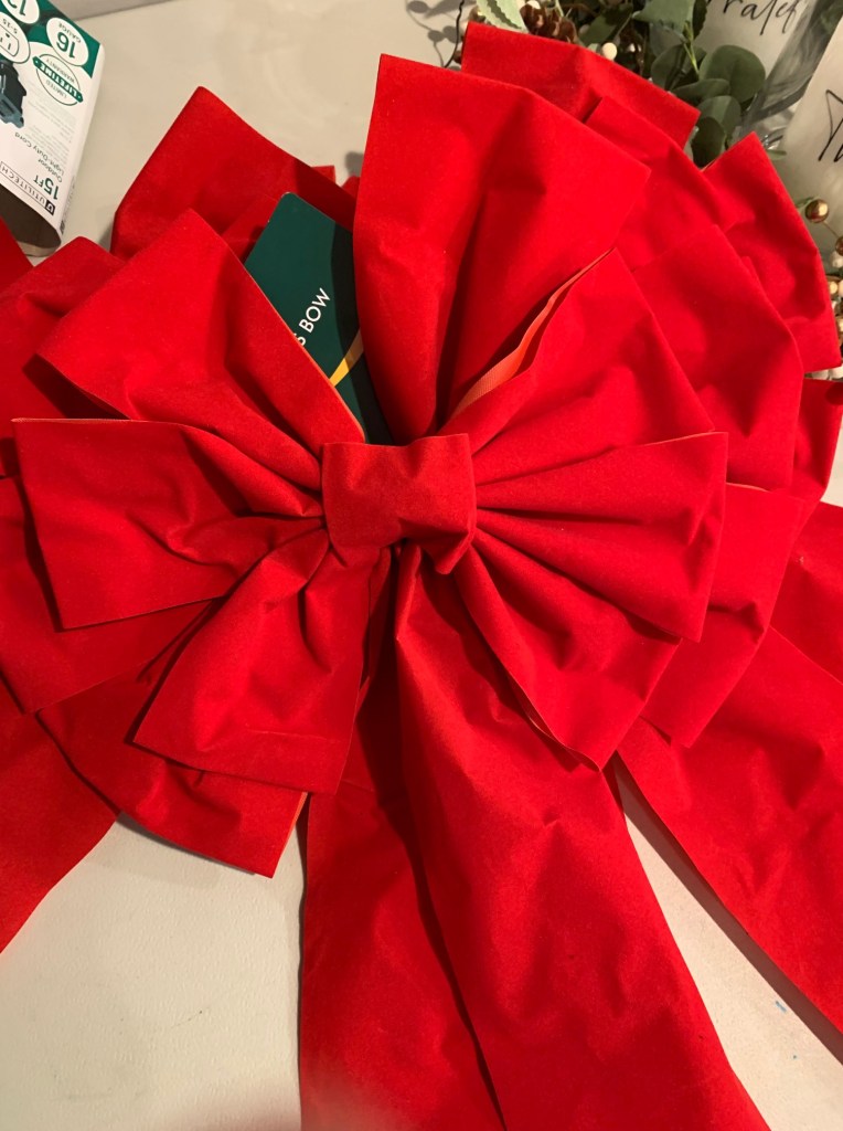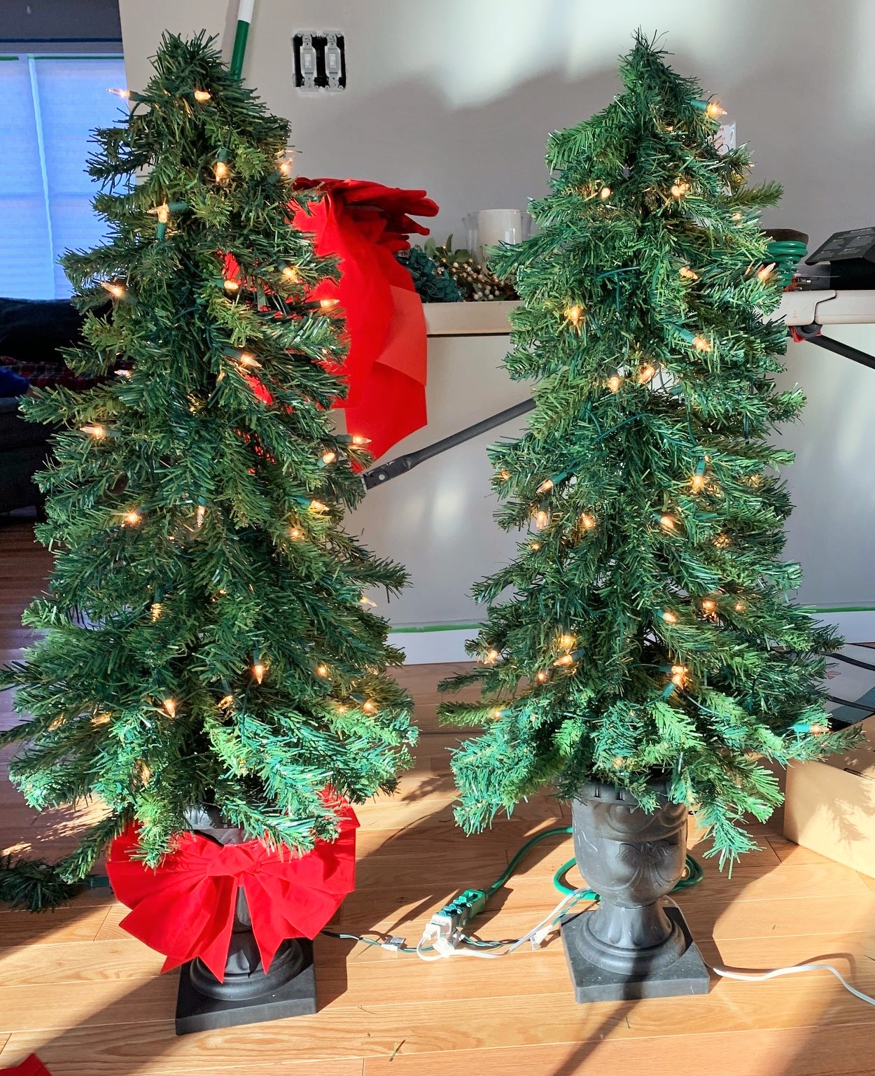 At Job Lot, I found these inexpensive bows and knew I could deconstruct them and get more than one bow out of them. I also found a pair of pre-lit artificial trees and some pre-lit garland. At the At Home store, I found more pre-lit garlands and a pre-lit wreath.