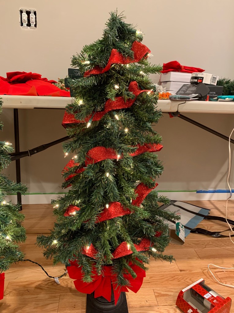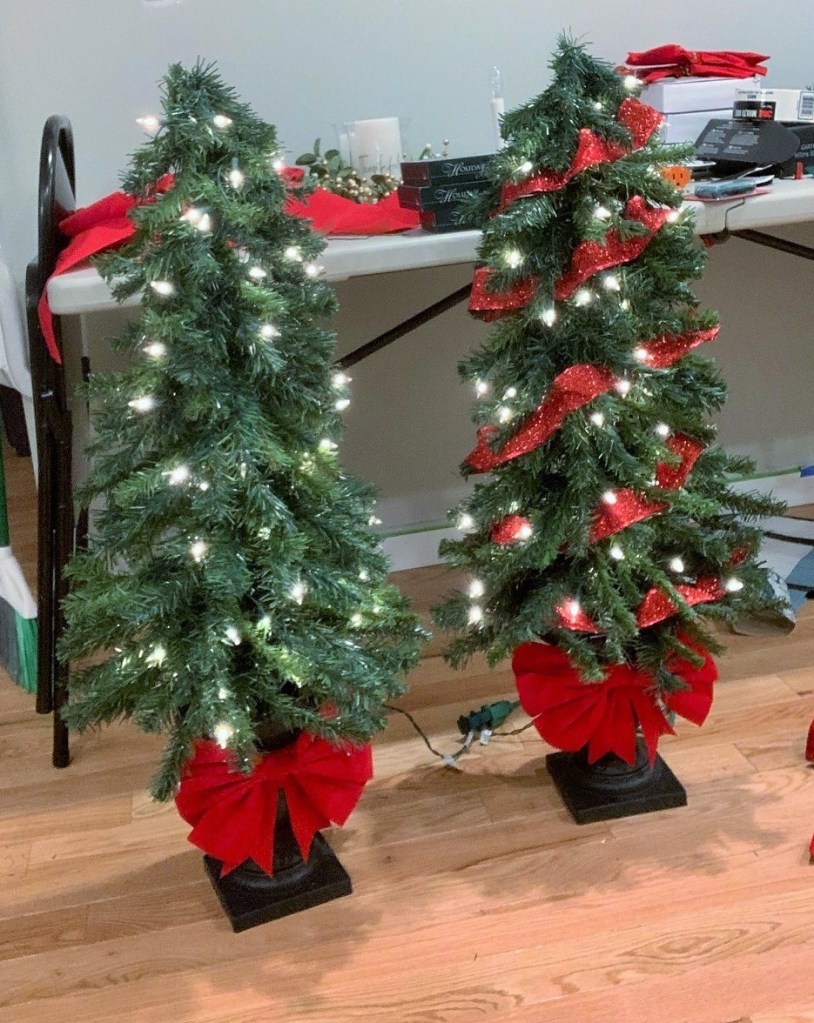 Even with the bows, I felt like the trees needed something more than just the lights. So I added sparkling wire-rimmed ribbon to each tree.