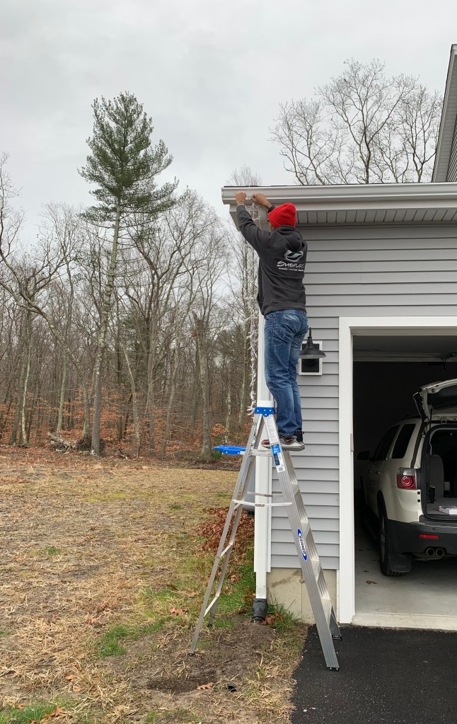 After I sketched out a quick idea Cruz and I went shopping to solidify the idea. Cruz decided on icicle lights and for this year strung them above our garage. It took 4 packs of lights to cover the length and side of the garage.