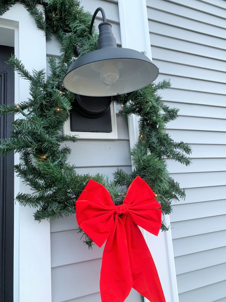 Once we had the garlands in place, I fluffed the garlands and shaped the faux wreaths tying in the smaller bow portions onto the wreath bottoms.