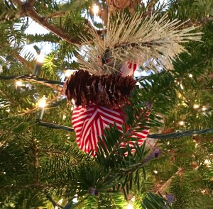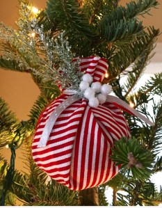 I used our old red ornaments and wrapped them with red and white striped fabric measuring 10″x 10″.  I secured the fabric to the ornament with ribbons in red, white and grey colors. Then using a glue gun I added different decorative pieces to the ornaments like sprigs, pine cones, and beads.