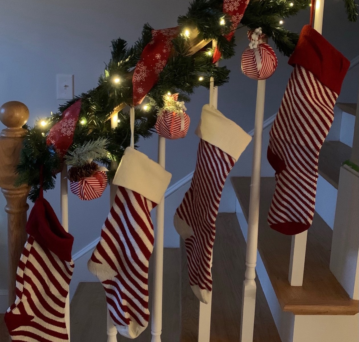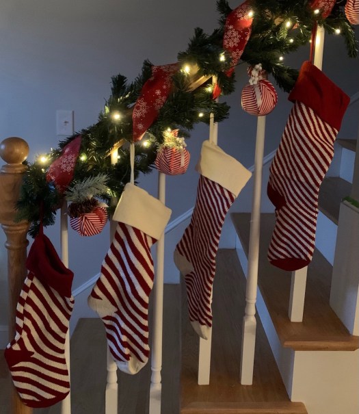 I used a pre lit garland, ribbon, and candy cane striped stockings to coordinate with the wrapped ornaments.