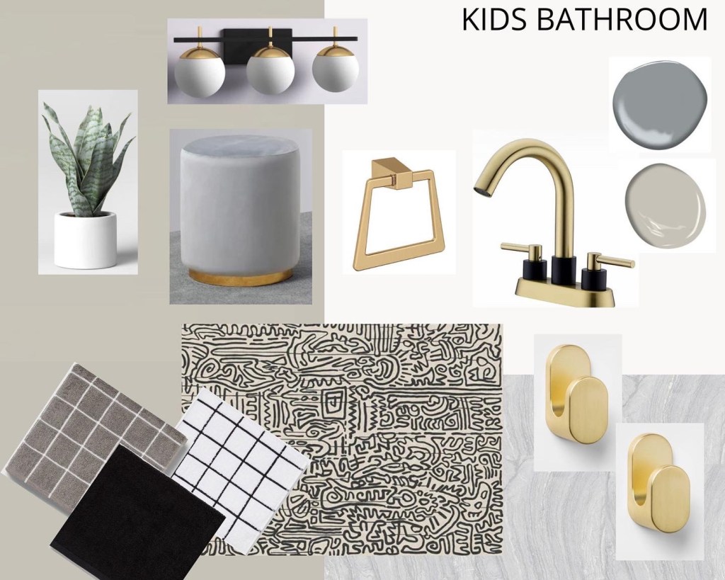 Because I have a son and daughter I want the bathroom to be unisex. Iโm going with a grey, black and white color scheme. Iโm also going to focus on drawer and cabinet storage and bath/shower organization.