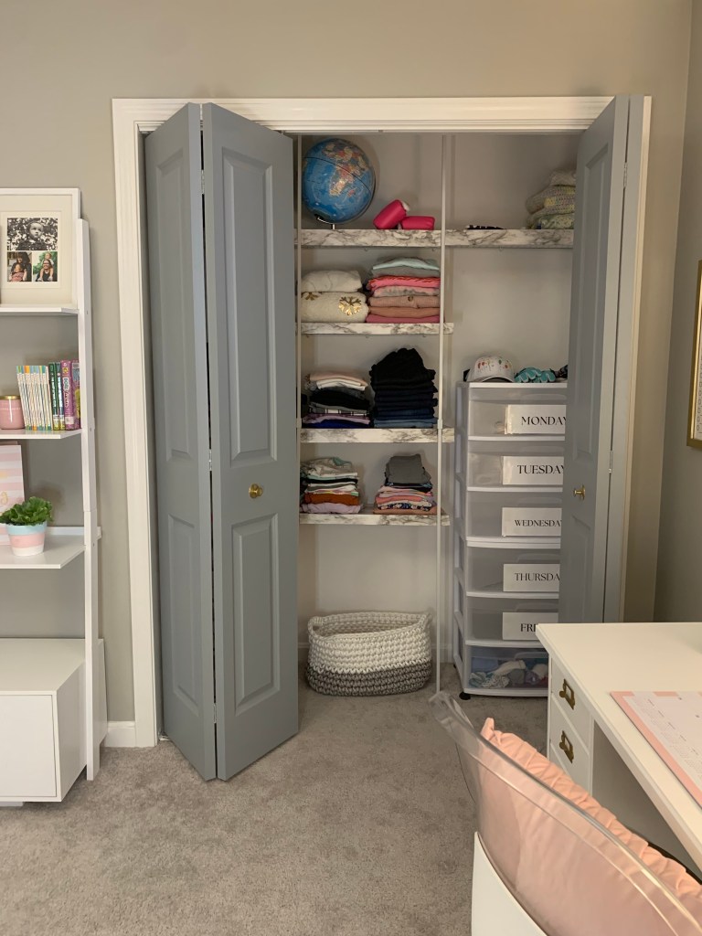 After she figures out her outfits, she plans out shoes (which we keep on a shoe rack in the laundry room) and any accessories etc. Planning like this each Sunday, allows for her mornings to be a bit easier, since her outfit and accompanied accessories are ready.