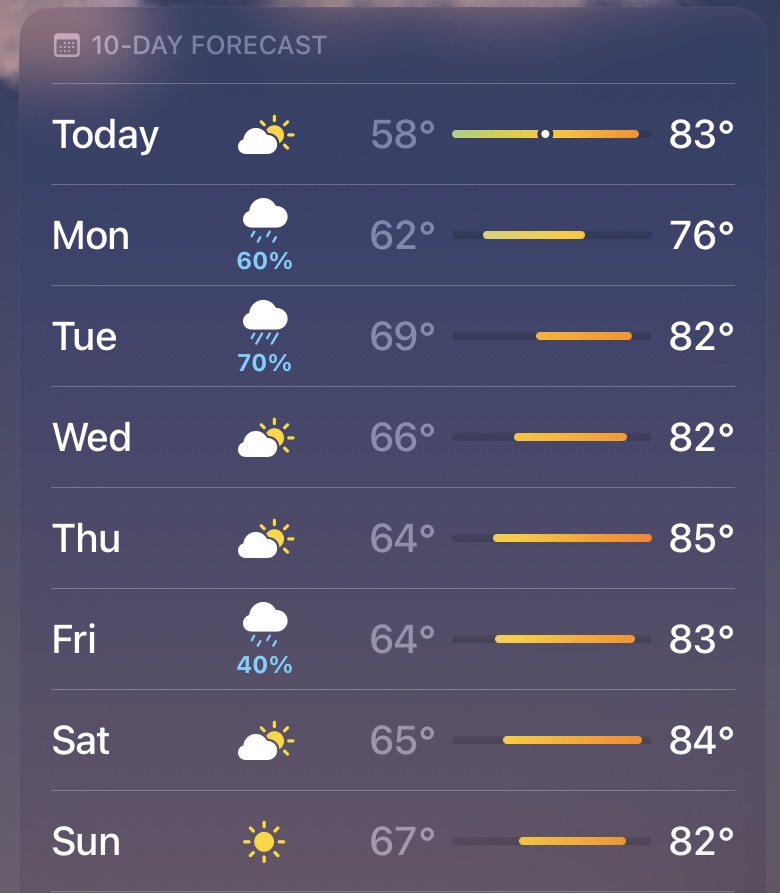 On Sundays, I pull up the weather app on my phone and explain each dayโs weather to my daughter -Monday through Friday.