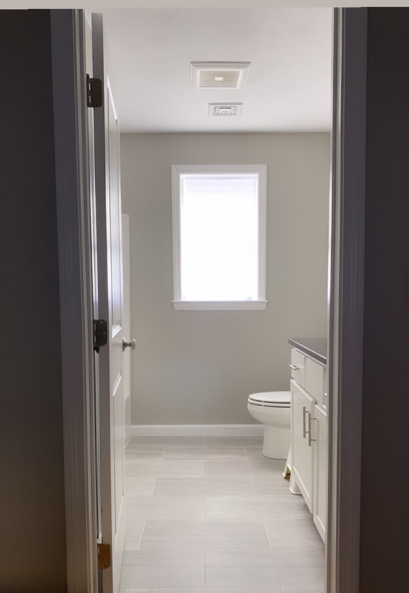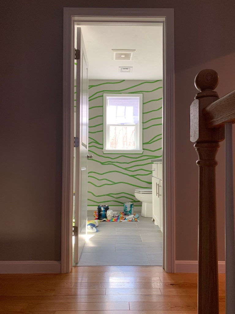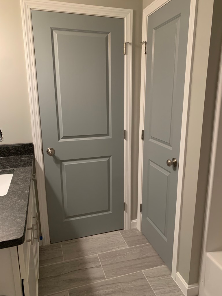 After taping up the beginning of the design I spent some time testing out the colors I wanted to use for the vertical lines to be added inside of the tape lines. My final color plan will incorporate the grey of the bathroom doors (pictured below), white to play off the trim and vanity in the bathroom as well as a lighter hue of the grey.