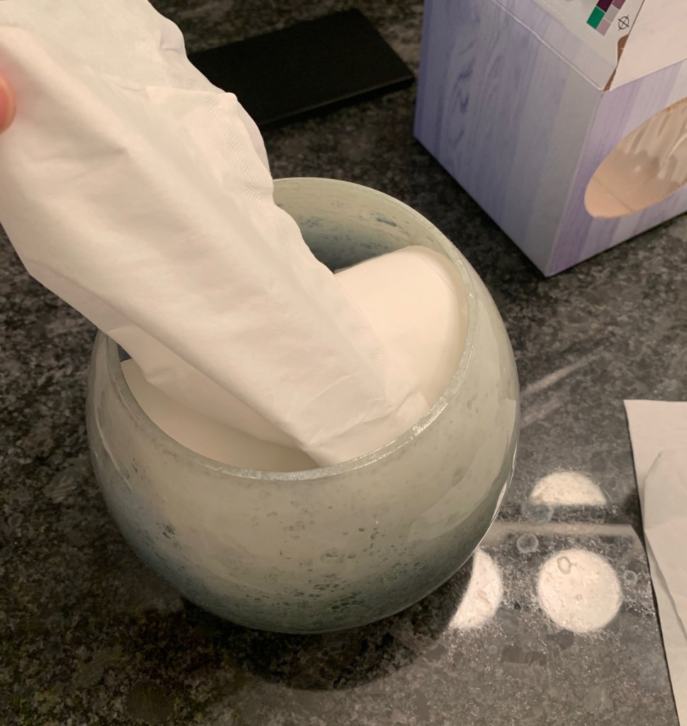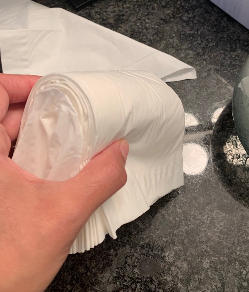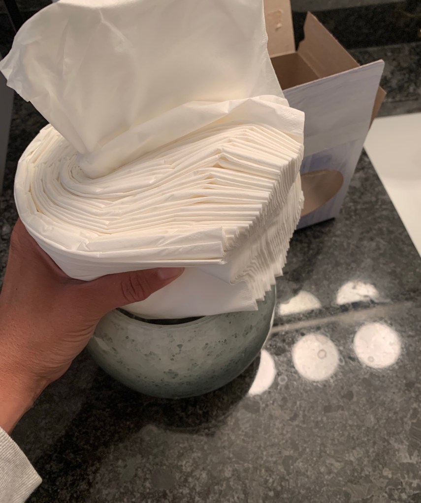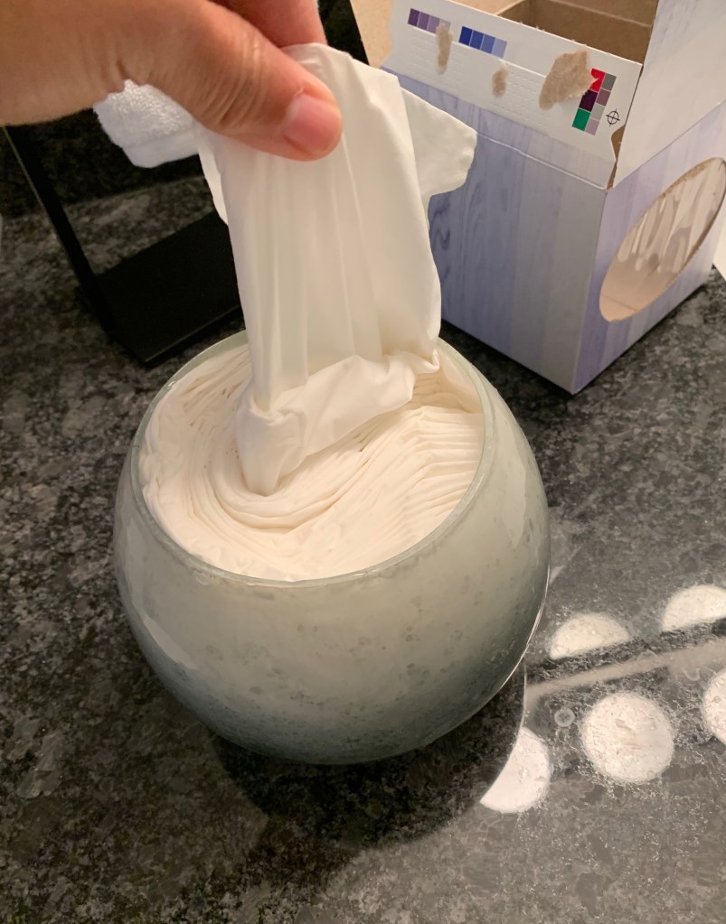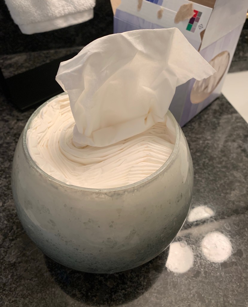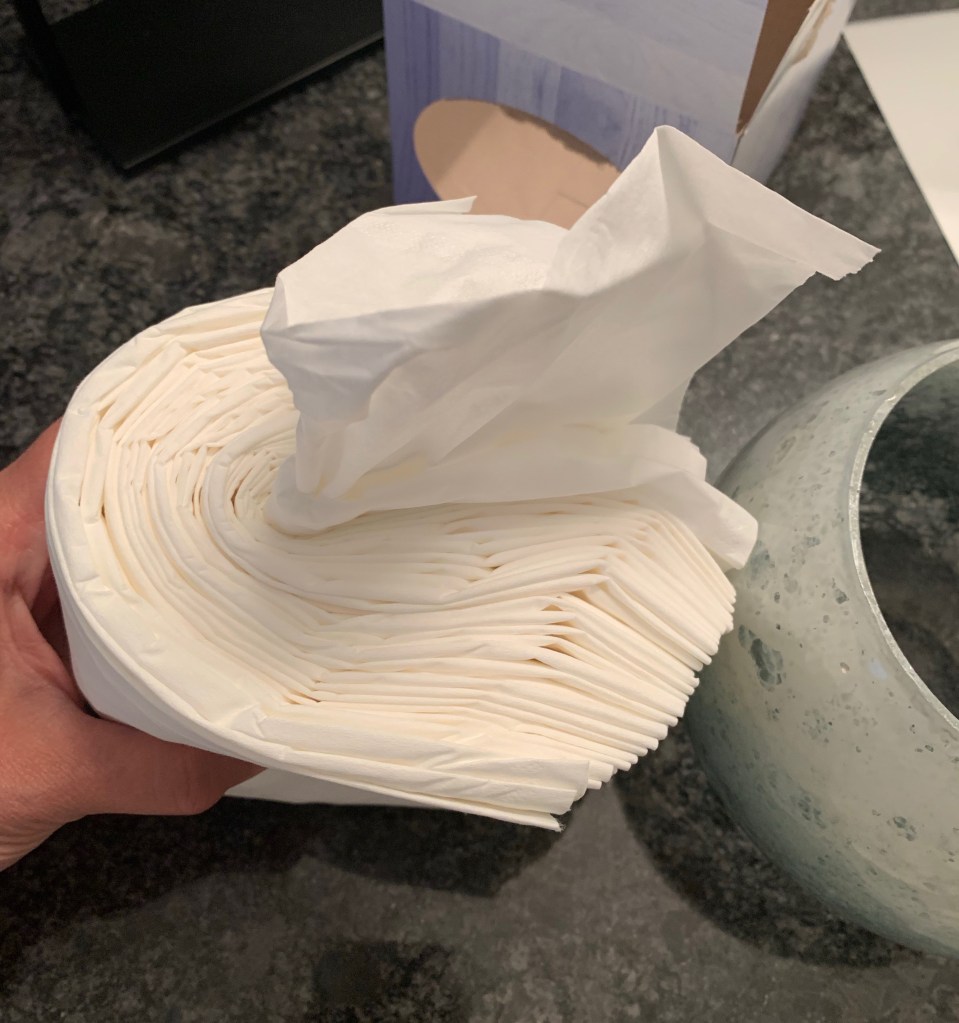 I created a short Reel tutorial on Instagram and Facebook, but recently I was asked to also provide a blog post with a tutorial- so here it is, the steps to transferring your tissues from the box to a decorative container.