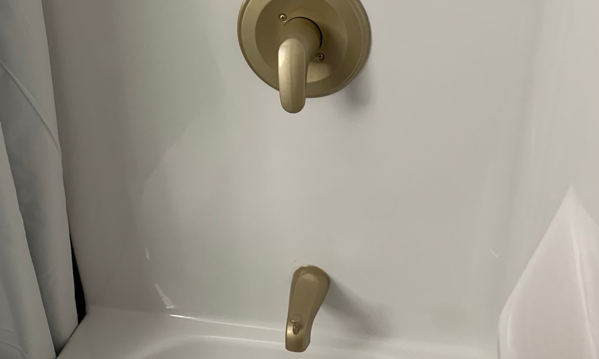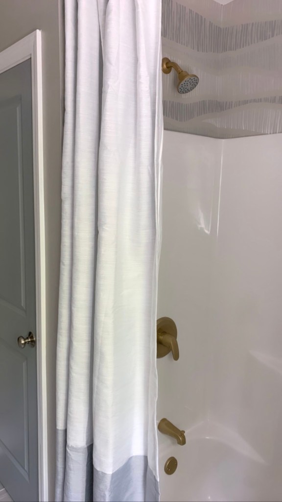 Recently, I decided to spray paint the tub hardware in my kidsโ bathroom. I used Behr Premium Spray Paint, in Champagne and Gold. I decided to mix the two spray paints in order to match my existing gold hardware on the bathroomโs vanity and faucet.