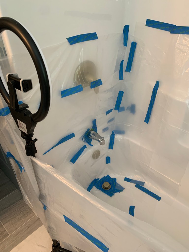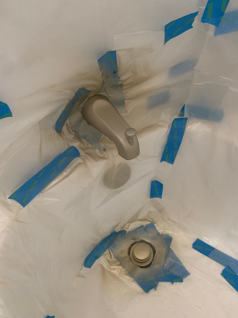 – Itโs important to account for overspray. I used plastic sheeting (which can be reused) and taped it around the hardware but also at least 12 inches in all directions.