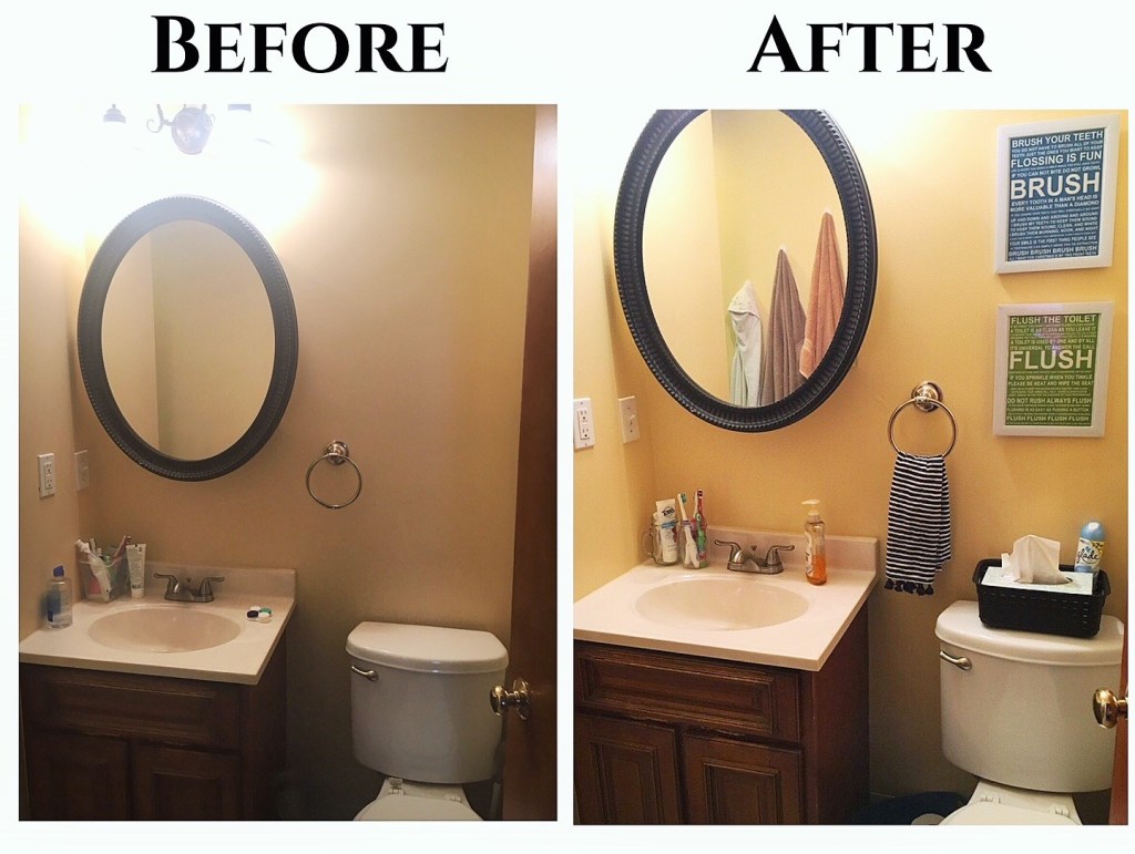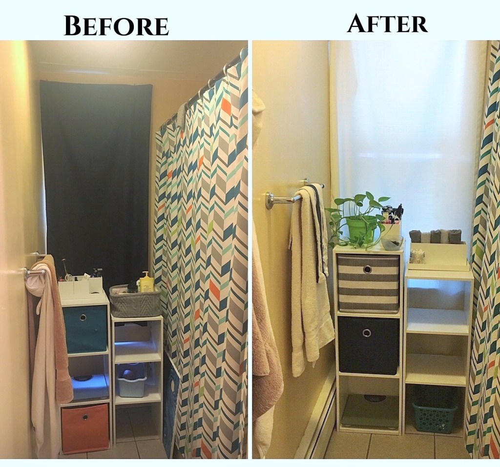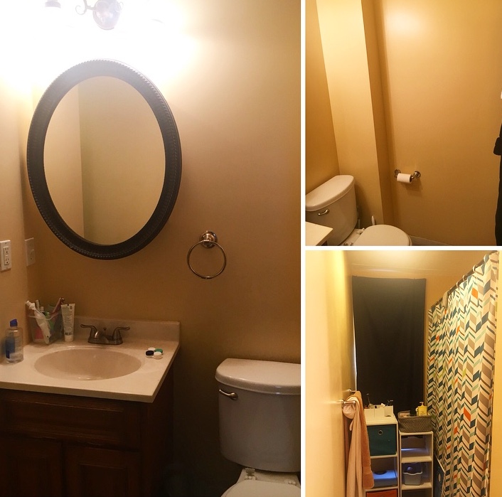 Keeping that in mind, I chose to revamp the bathroom. In this apartment, we had one small bathroom and it had to function for our whole family. Some of the things that made the space hard to use were the lack of storage ( we had no linen closets or coat closets in the full apartment) and how dark it felt.