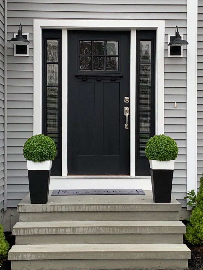 Last year, I transformed 2 outdoor planters I found at the At Home Store. I loved the shape and size of the planters but not the color. So I painted them and then added faux boxwoods that I found at Hobby Lobby. ( For the full process click HERE)
