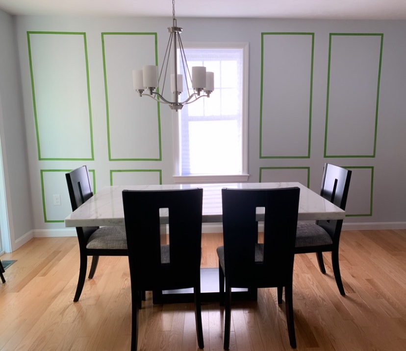Our downstairs floor plan is an open concept. With the dining room and living room so close, I knew when we bought our home I wanted to create some distinction between the two. An easy way to do this is to add box molding or wainscoting to the wall. Although wainscoting is the traditional route, I wanted to use box molding because I’m not sure the direction I want to go with the dining room yet, in terms of design, and I feel the box molding is more versatile for different design aesthetics.