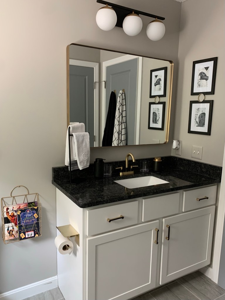 So I scrapped the idea and found a โno drillโ towel rack on Amazon. Iโm hoping this option will work and solve our washcloth issue in the kidโs bathroom.