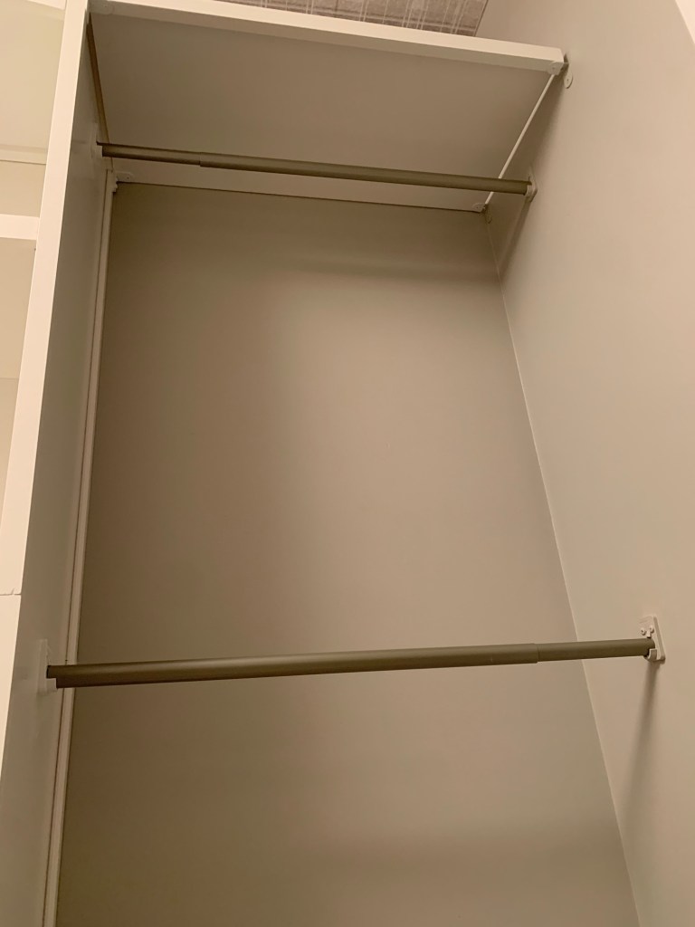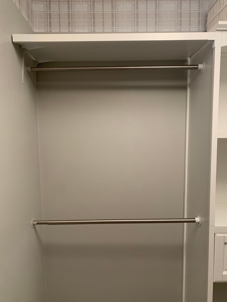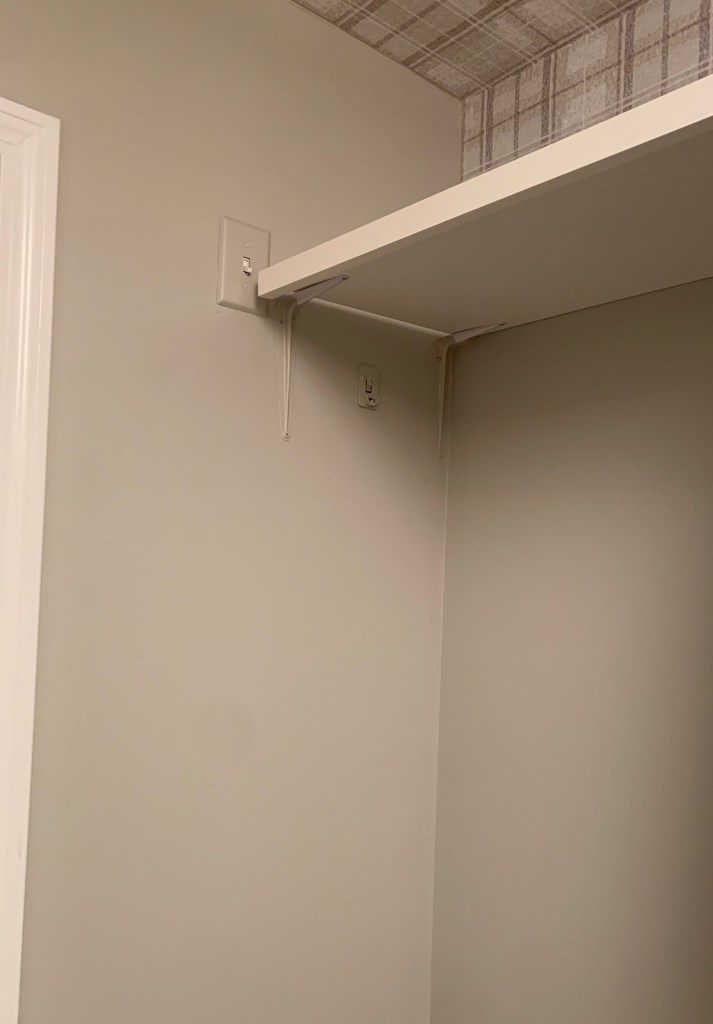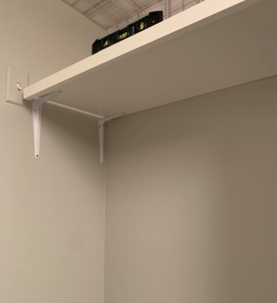 The most frustrating part of the closet installation was the shelving. The original plan was to mount the towers in the center of each wall and create a symmetrical layout. But the placement of the studs in the wall, meant that idea was out the window. Because we didnโt want to create a new bracket for the wall, we mounted the towers off center and then needed to cut two shelves down and extend two shelves.
