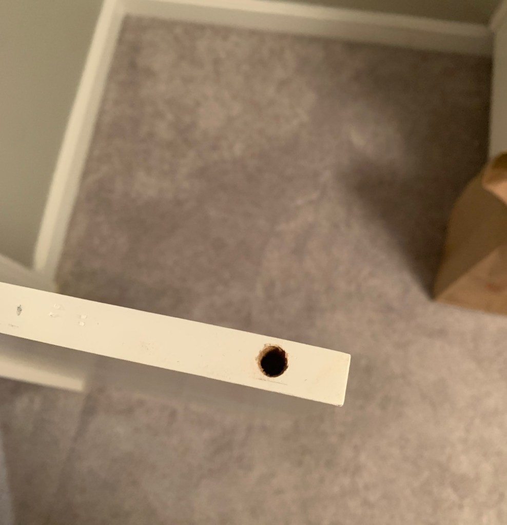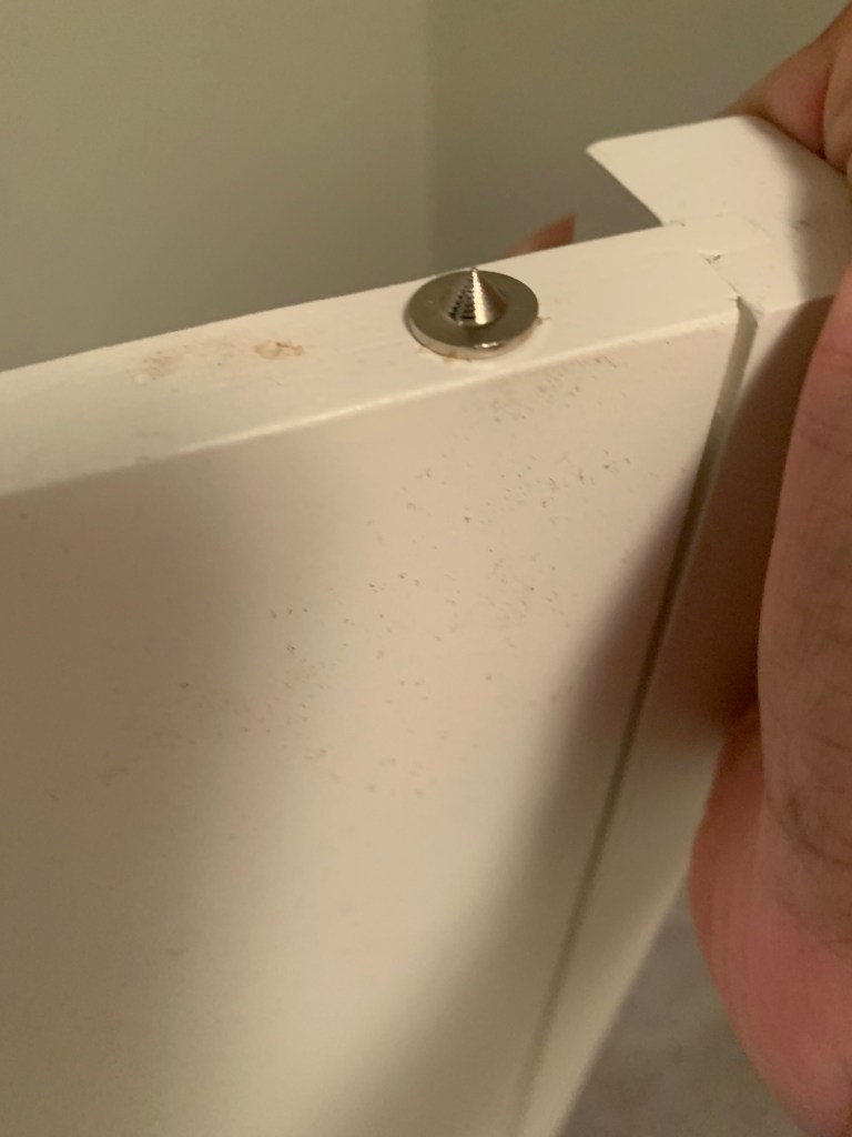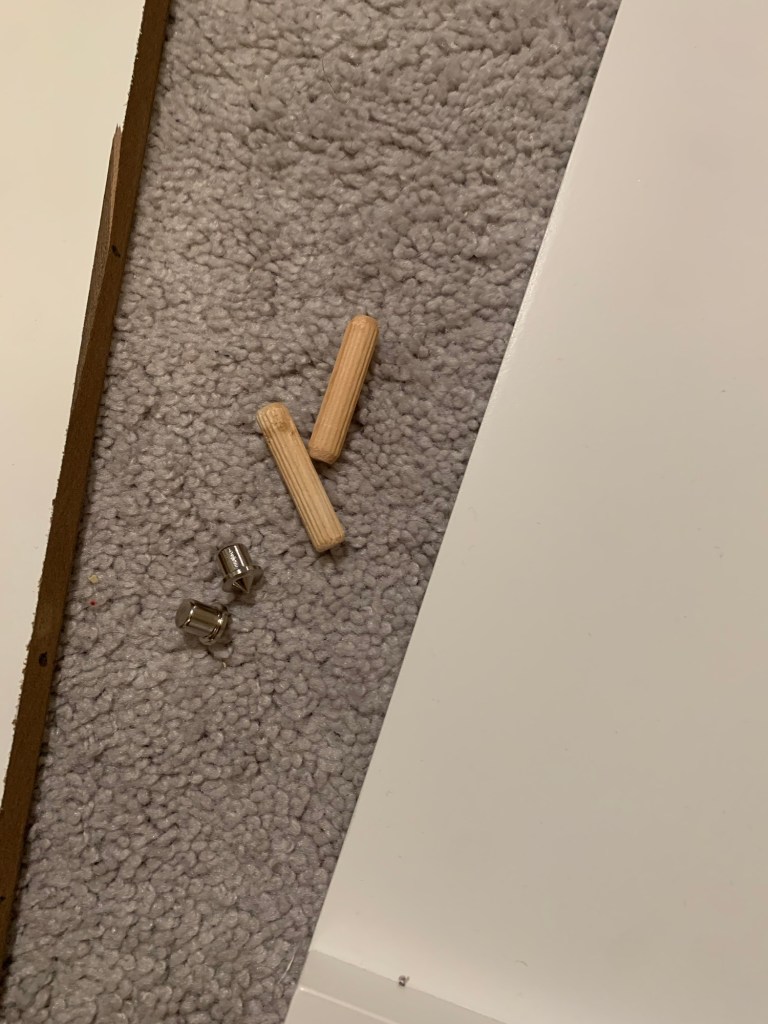 Once the holes were drilled we added in the metal inserts and placed the other shelf onto the seam to mark were to drill the holes on the other piece of wood.