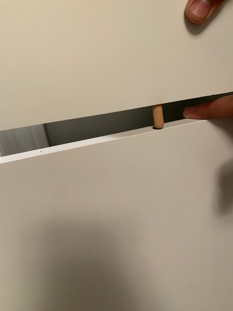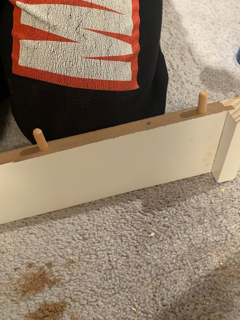 Then we added in the dowels to see how well they fit. Once we tested out the dowel holes, we added wood glue to the shelf sides and the dowel holes and placed the dowels into each hole connecting the two pieces of shelving to create one longer shelf.