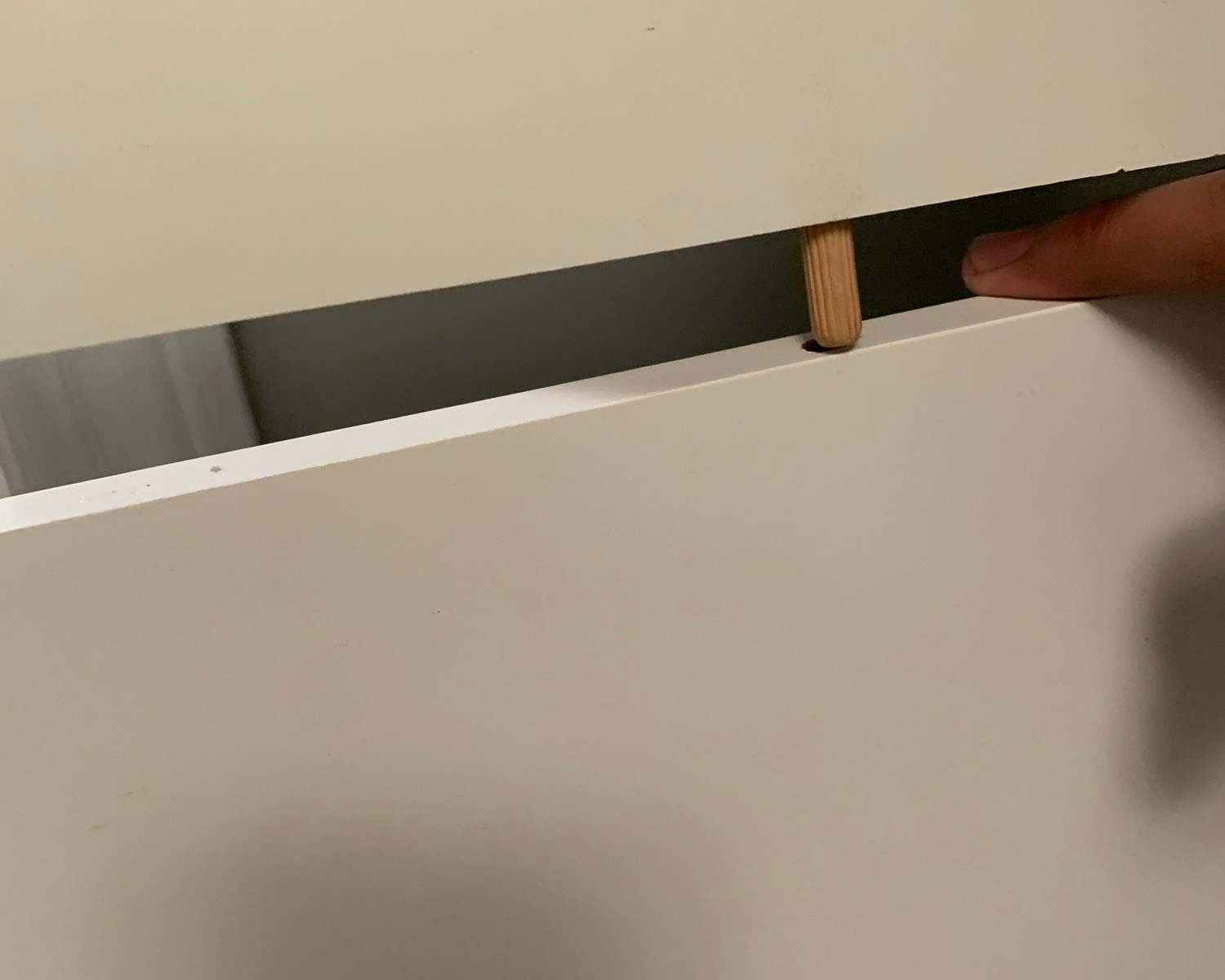 In order to extend the shelving, we needed to add in some dowels to create a firm bond for the two pieces of wood. To do this we purchased a dowel jig kit from Home Depot. It came with dowels, a drill bit and metal inserts to mark the dowel placement. and added in dowel holes to the shelf sides.