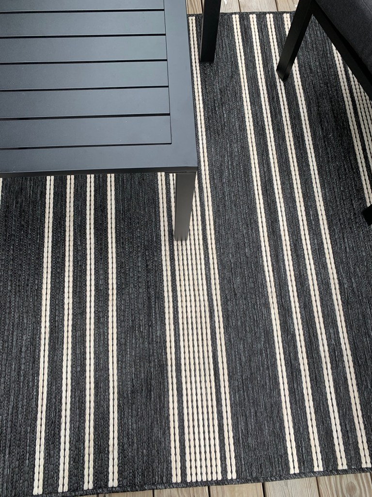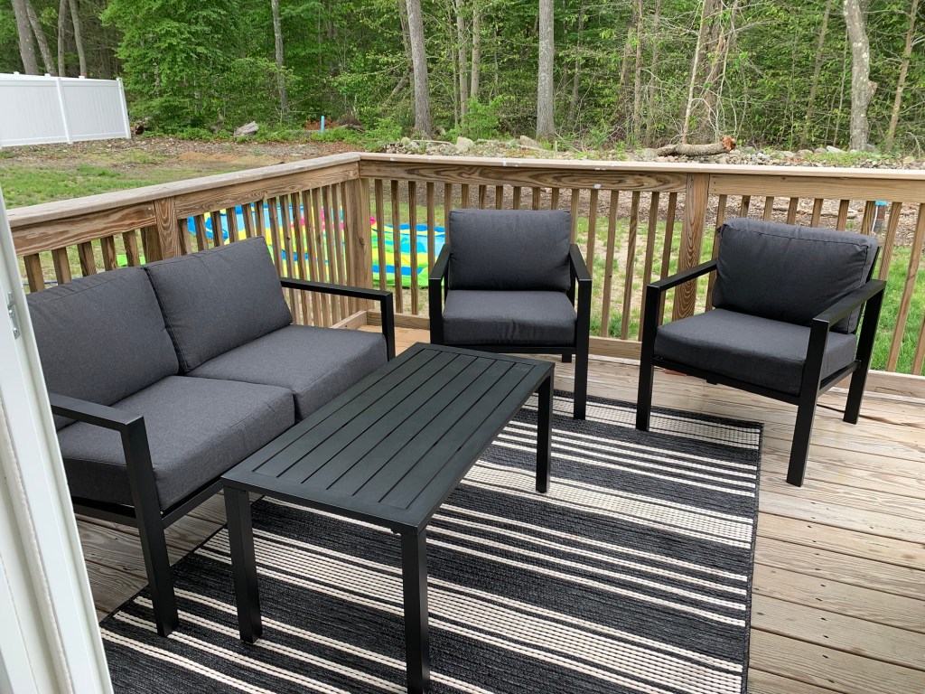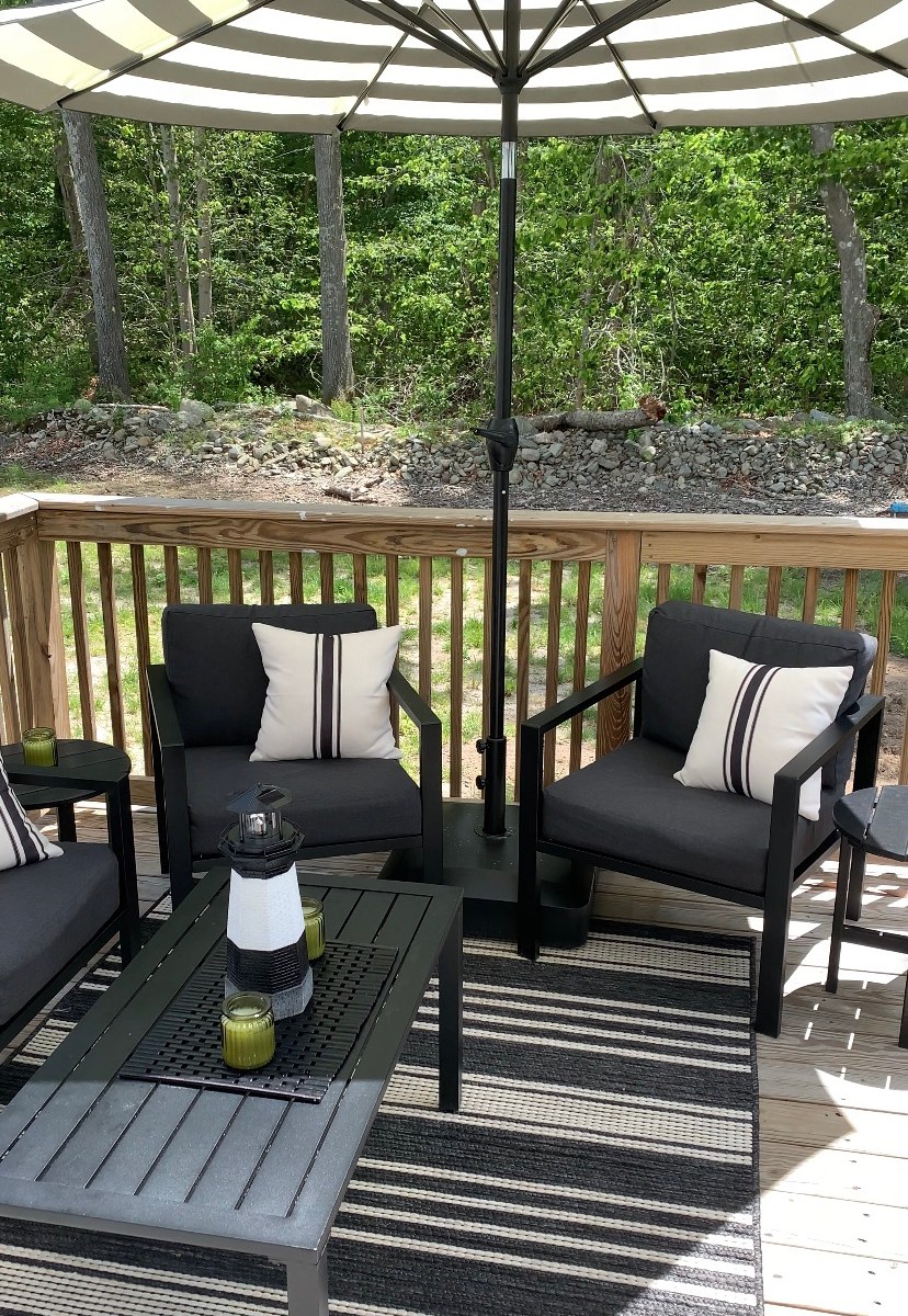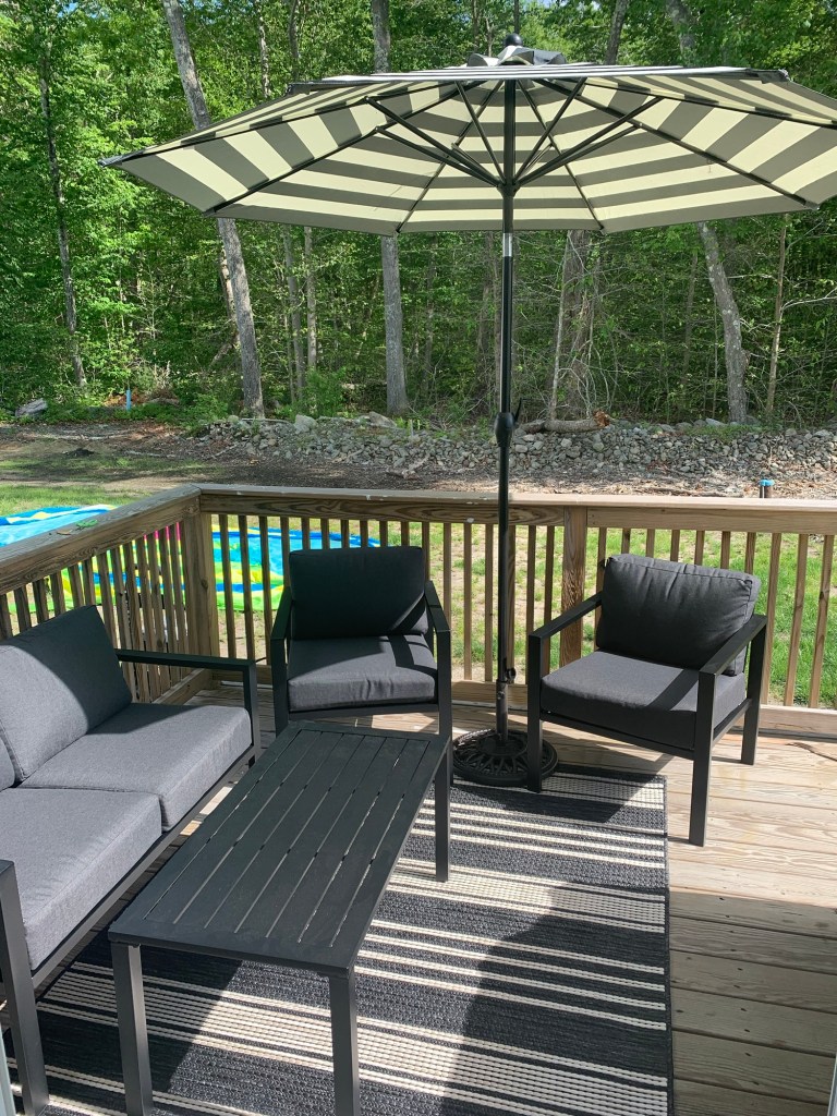 I knew I wanted a simple set, affordable and on the smaller side, since our back deck isnโt that big. I found not only the patio set at Walmart, but a rug, 2 side tables and an adjustable umbrella!