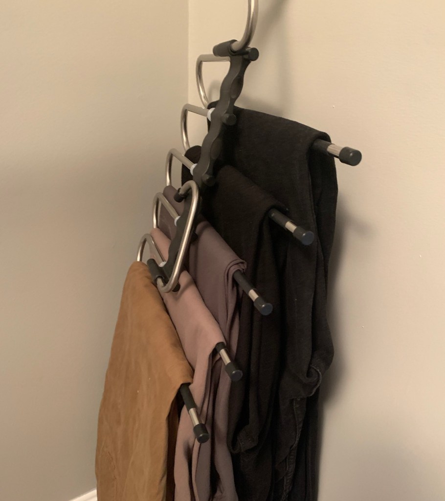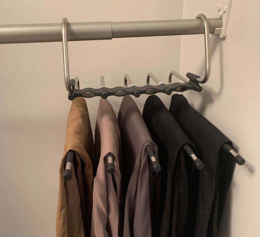 Although all of our tops are hung on traditional hangers, I did swap out traditional hangers for our pants. I decided to hang our pants on these pants hangers sold on Amazon. They are awesome. They make putting pants away after laundry so easy. I don’t even take the hangers off the closet rods. They also fold down for more storage, which is so convenient.