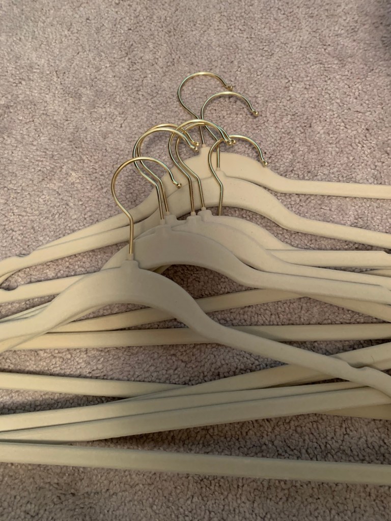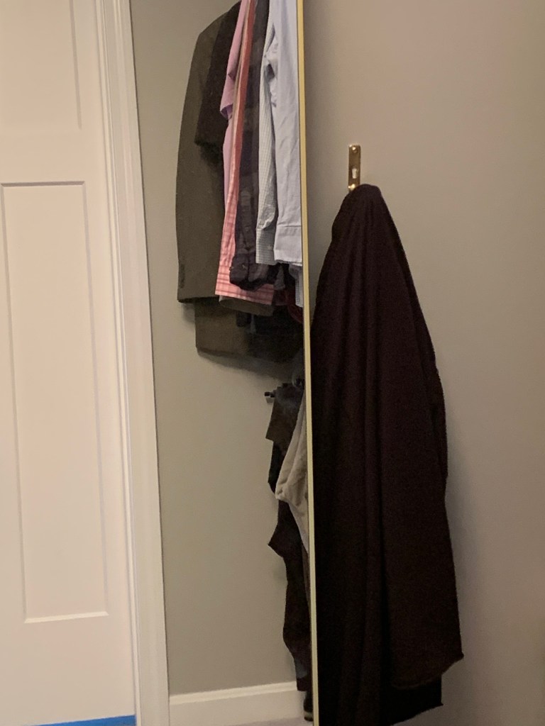 One of the things I enjoy about DIY and home decor is picking out the details. I also enjoy figuring out how a space can function better than it did before. One of the first thing I changed in the closet were the hangers, this was more of an aesthetic move on my part. But when the hangers came in, I realized that their velvet feel keeps our clothing in place. This is better than the plastic hangers we originally used.