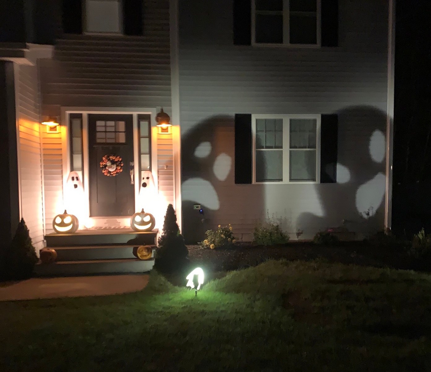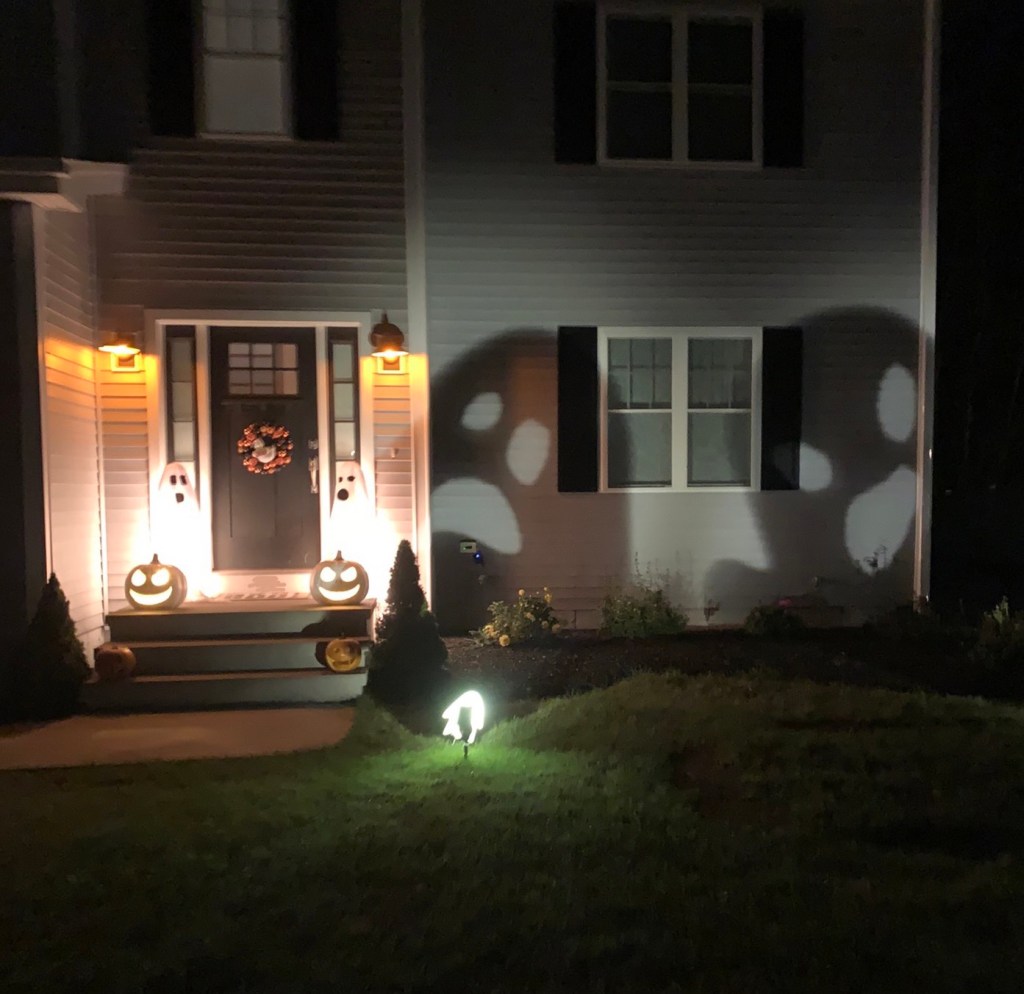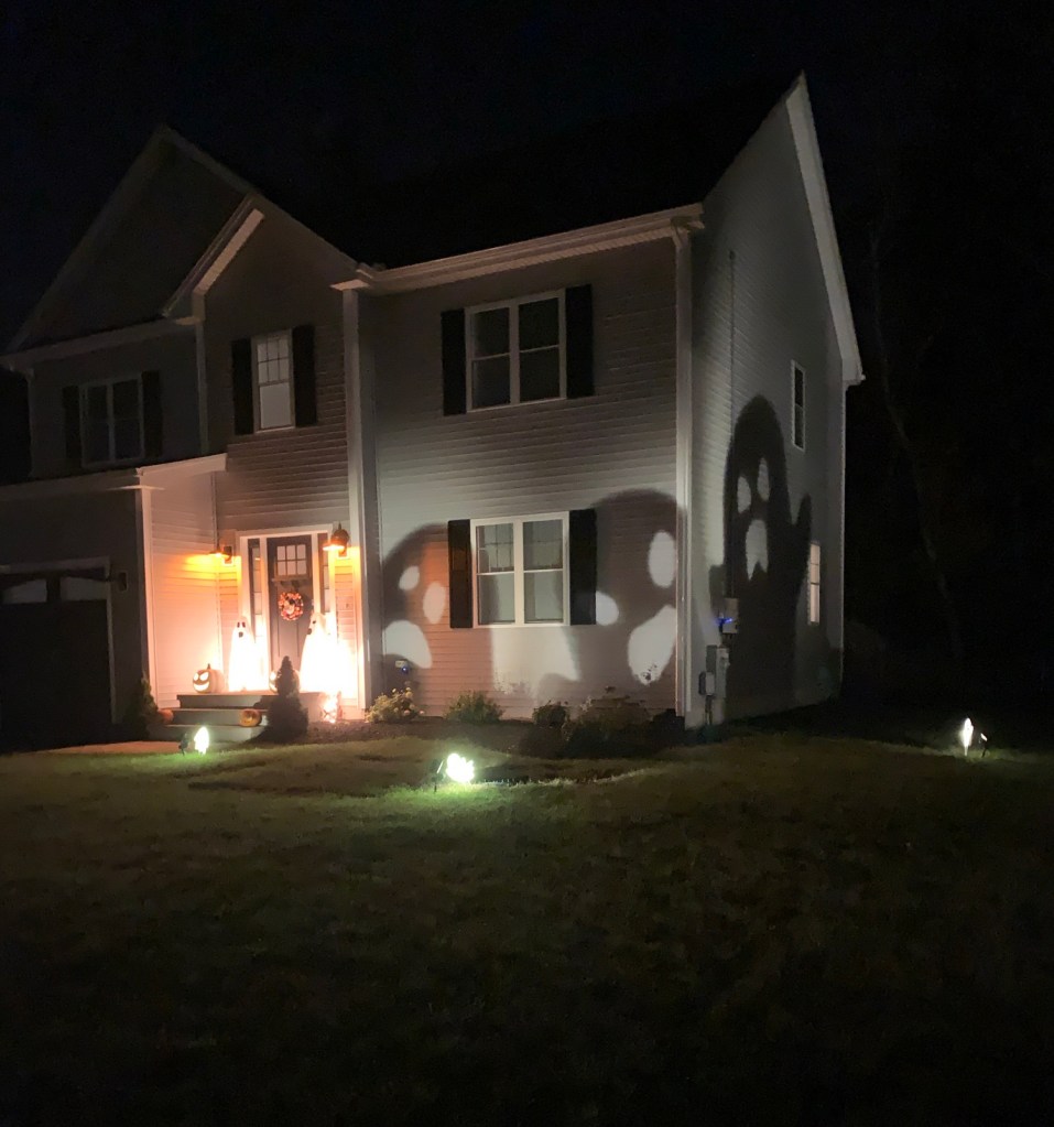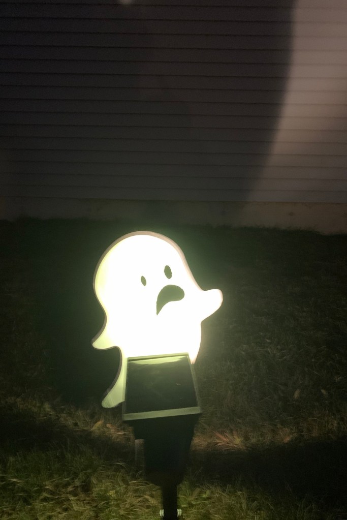 Once the ghost cut outs were complete, I added them to the yard with solar spotlights focused on them.