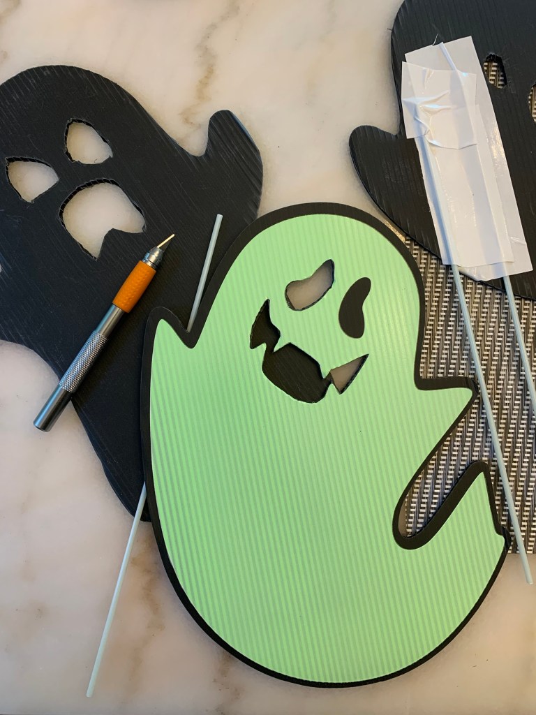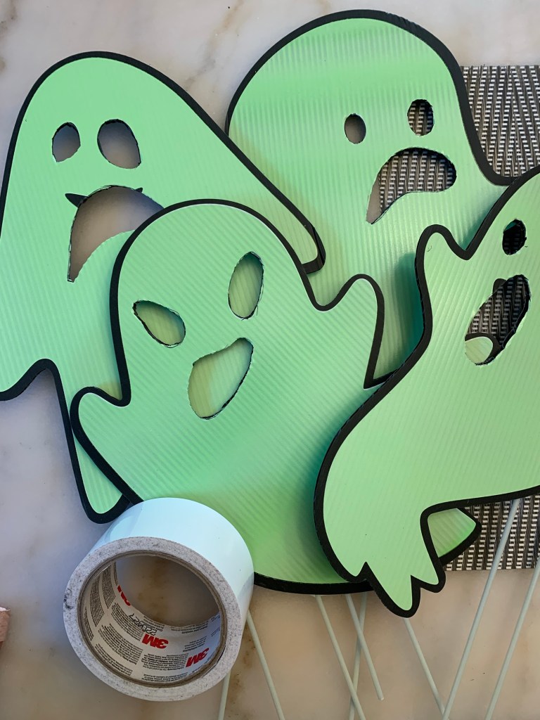 I purchased yard stake plastic ghosts from Amazon. Most of the ghosts had smiling faces. I redrew the mouth and eye shapes. Then, I cut them out with an Exacto knife.