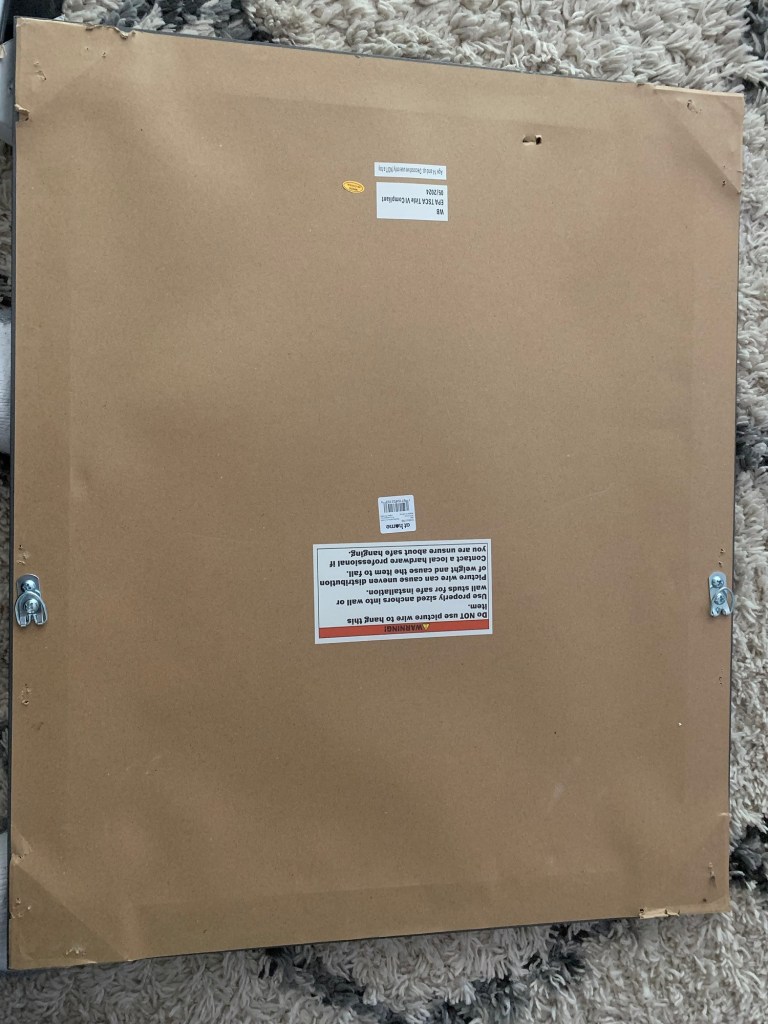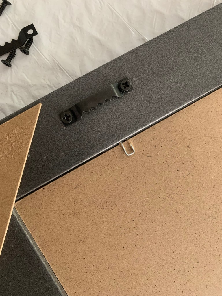 After, add the new photo/artwork into the frame with the mat and backing. Close the prongs and add hooks back onto the frame. You can use the ones that come with the frame. I add my own hooks.